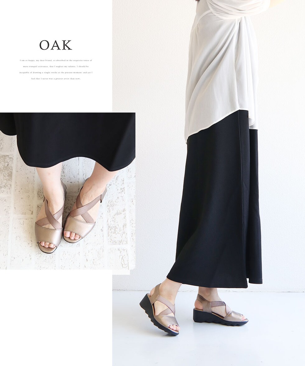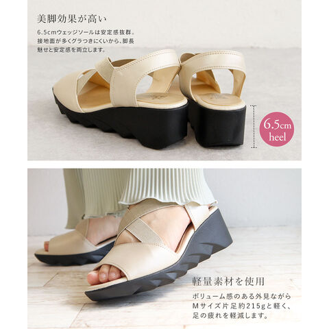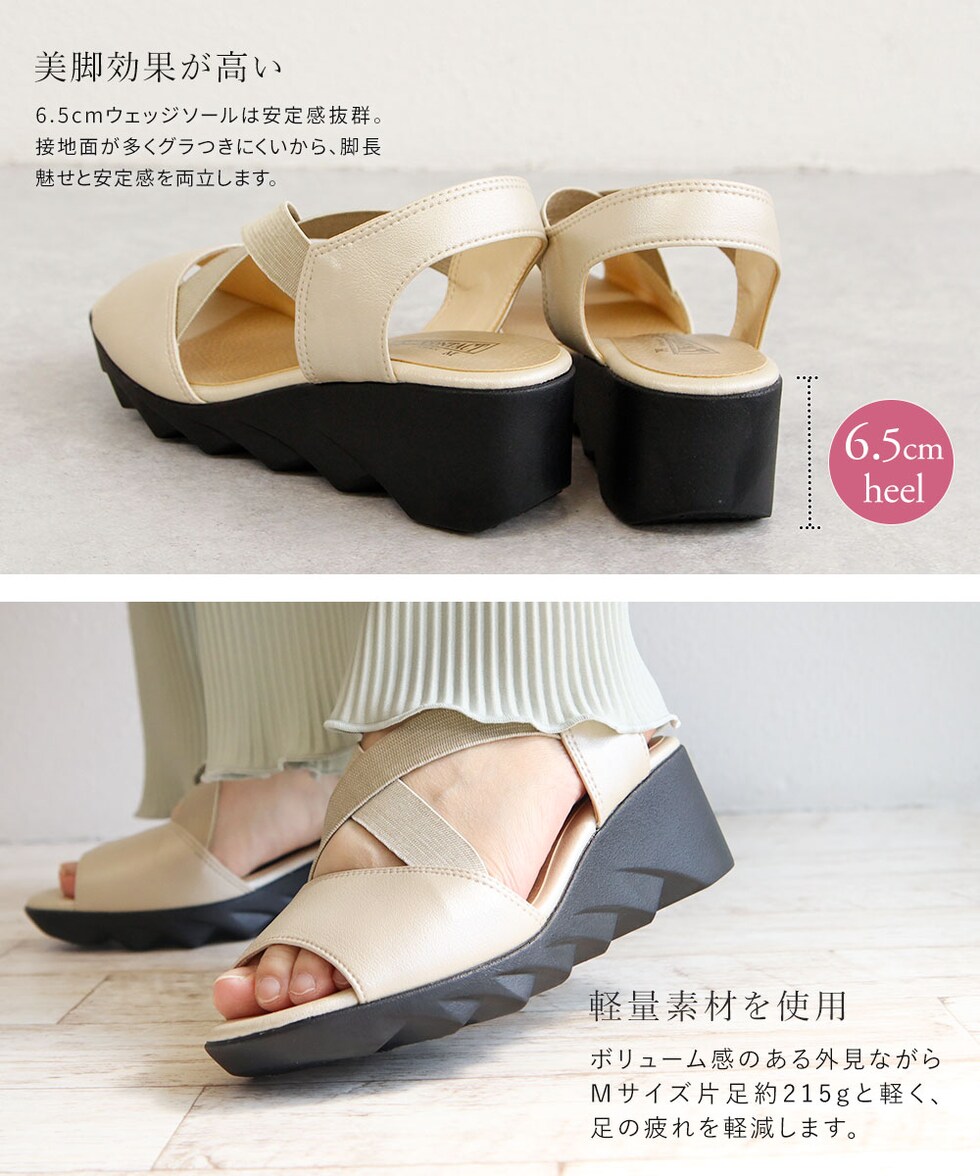 ウェッジソールは接地面が多くグラつきにくいから、脚長魅せと安定感を両立します。
