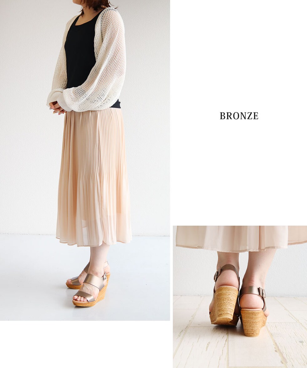 ウェッジソールは接地面が多くグラつきにくいから、脚魅せと安定感を両立◎。