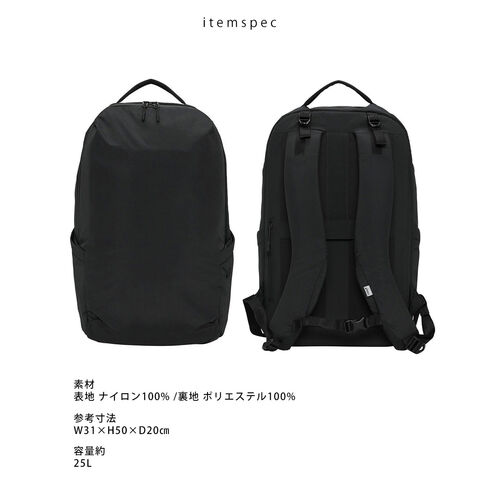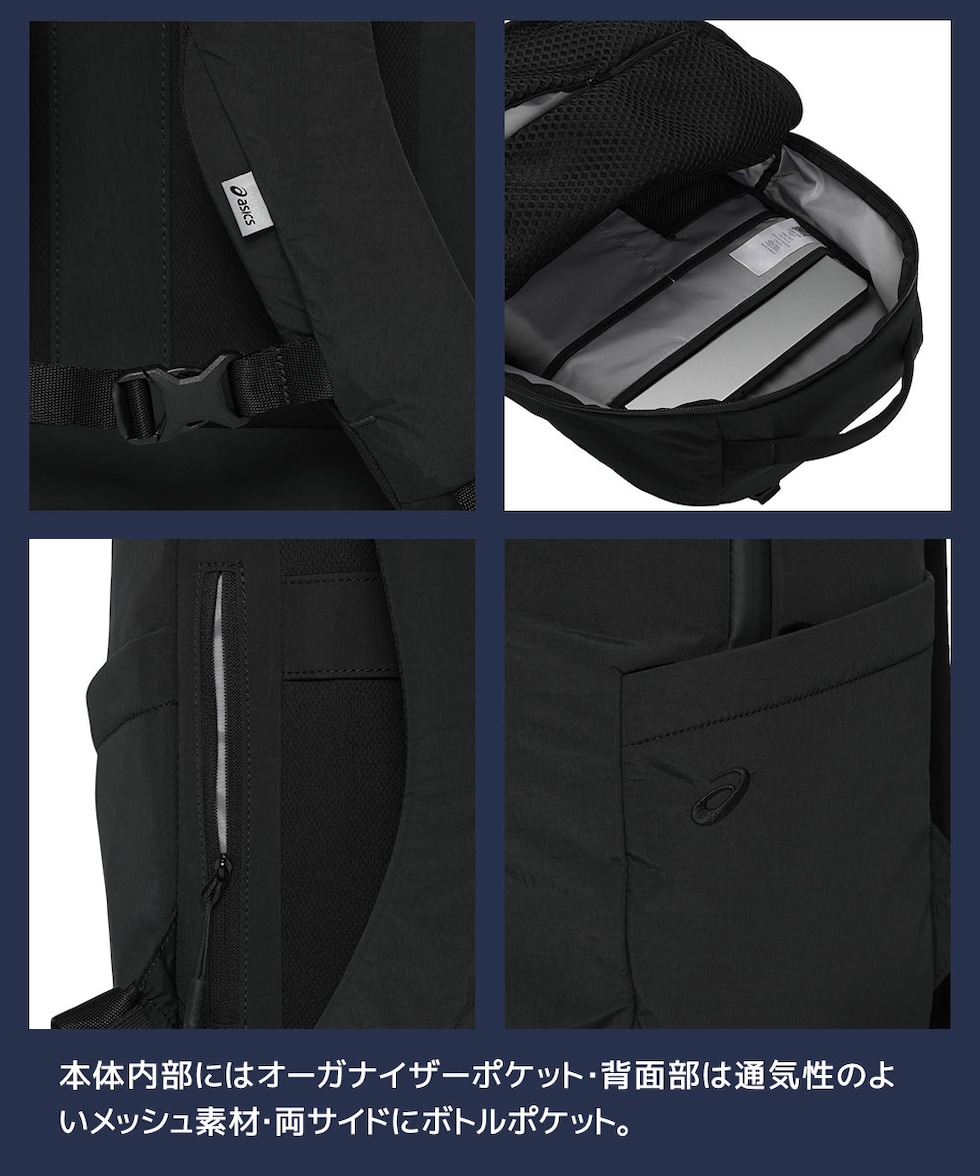 本体内部にはオーガナイザーポケット・背面部は通気性のよいメッシュ素材・両サイドにボトルポケット。