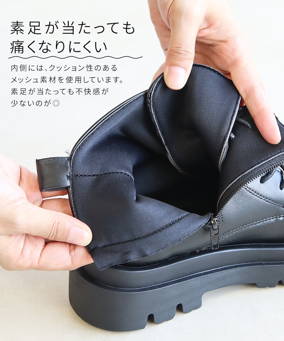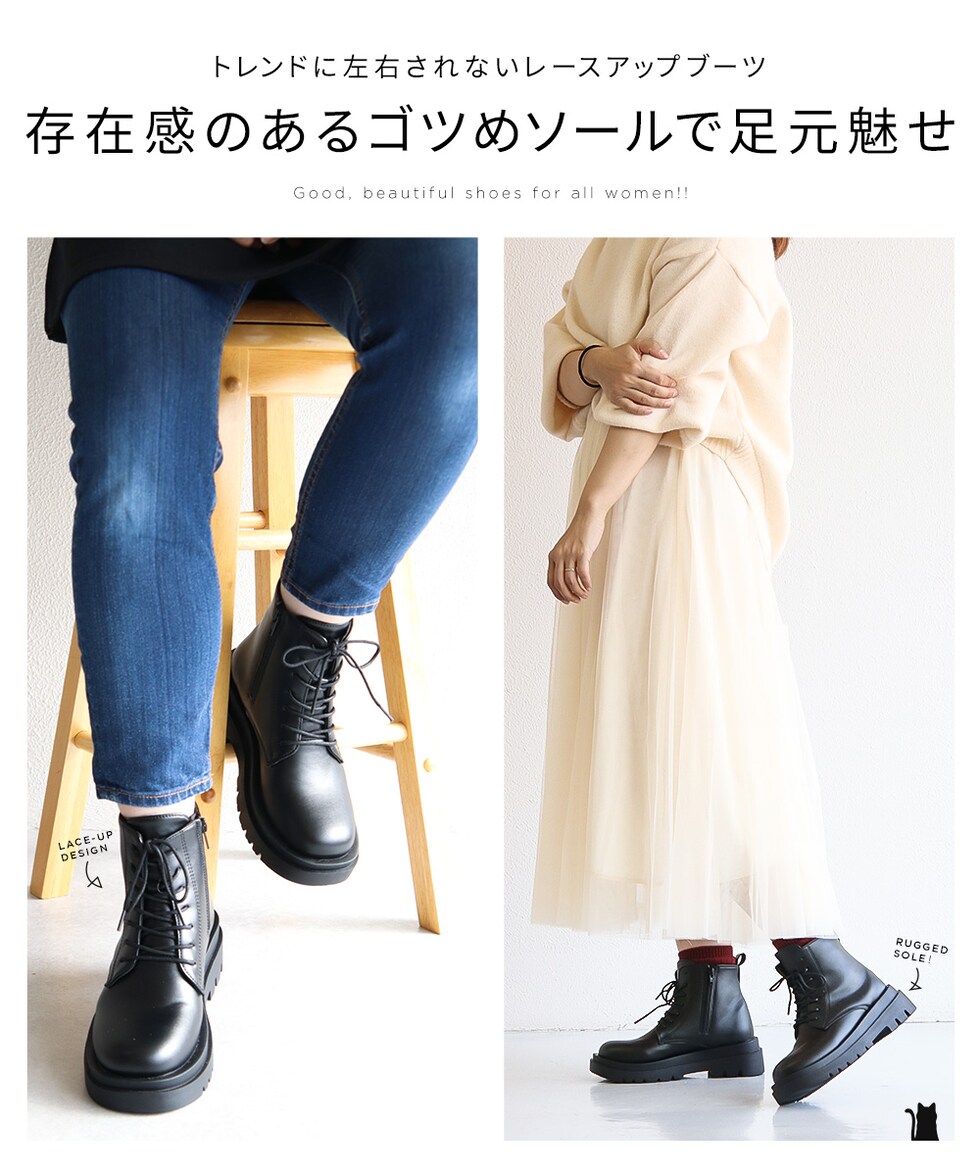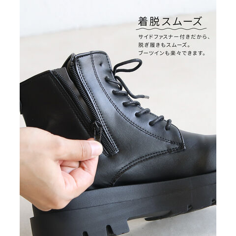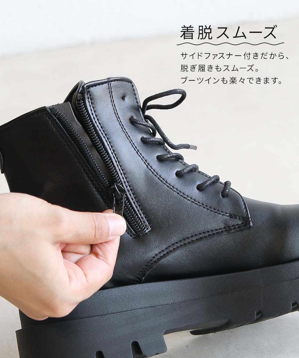 編み上げデザインがコーデのアクセントになりつつ、サイドファスナー付きで脱ぎ履きもスムーズ。