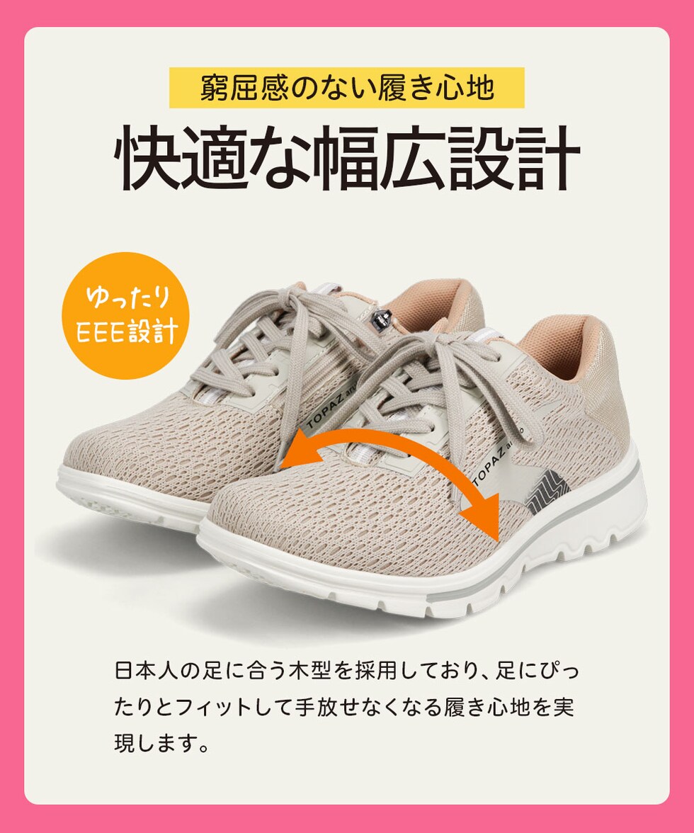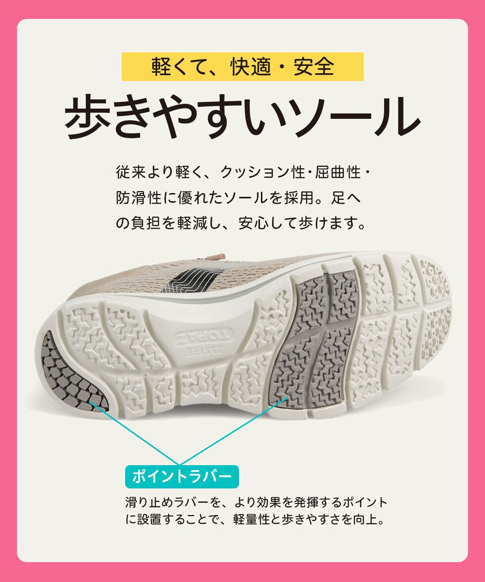ゆったりとしたラストや滑りにくい靴底など、快適で歩きやすい機能がたくさん詰まった「トパーズ」のウォーキングシューズです。