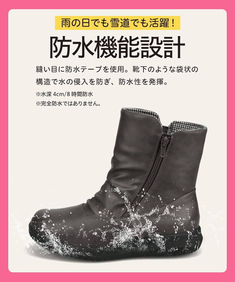 靴の中に水が浸入しにくく雨の日も快適に歩けます。