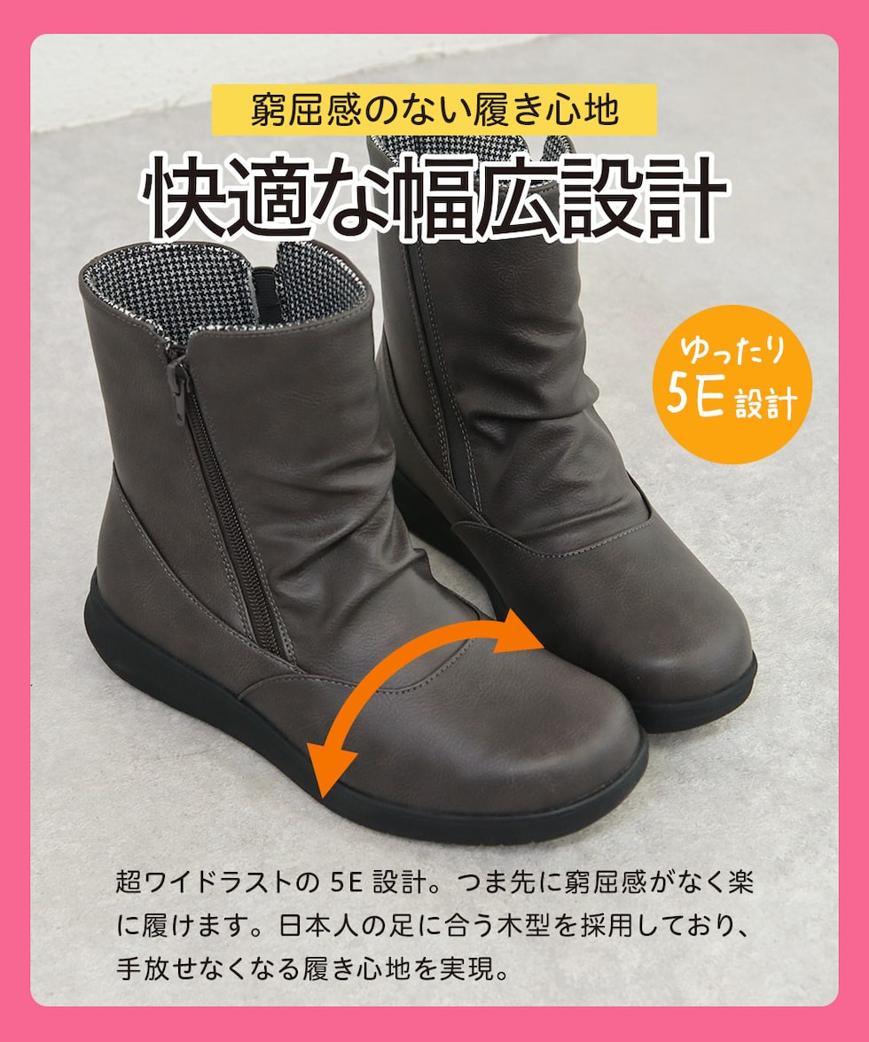 日本人の足先の形に合わせた、ゆったり幅のつま先。 EEEEE超ワイドラストを使用し、幅広足さんや外反母趾の方にも優しい造り。