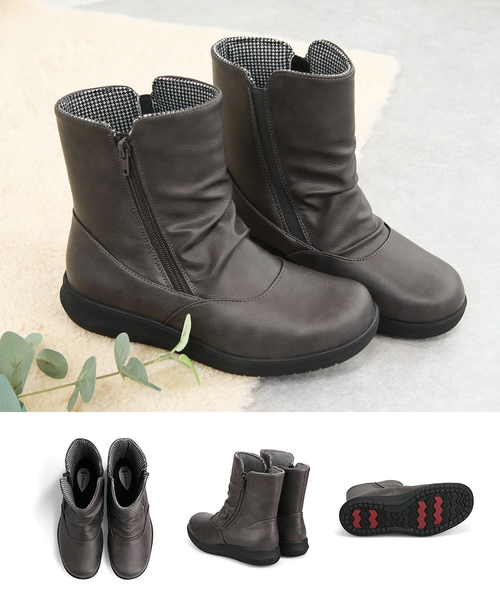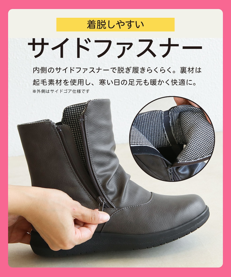 サイドのファスナーとスリットゴムで足入れしやすく、やわらかな履き心地。