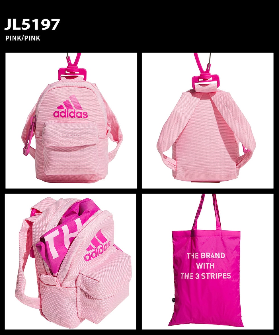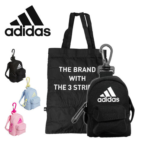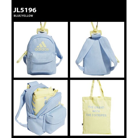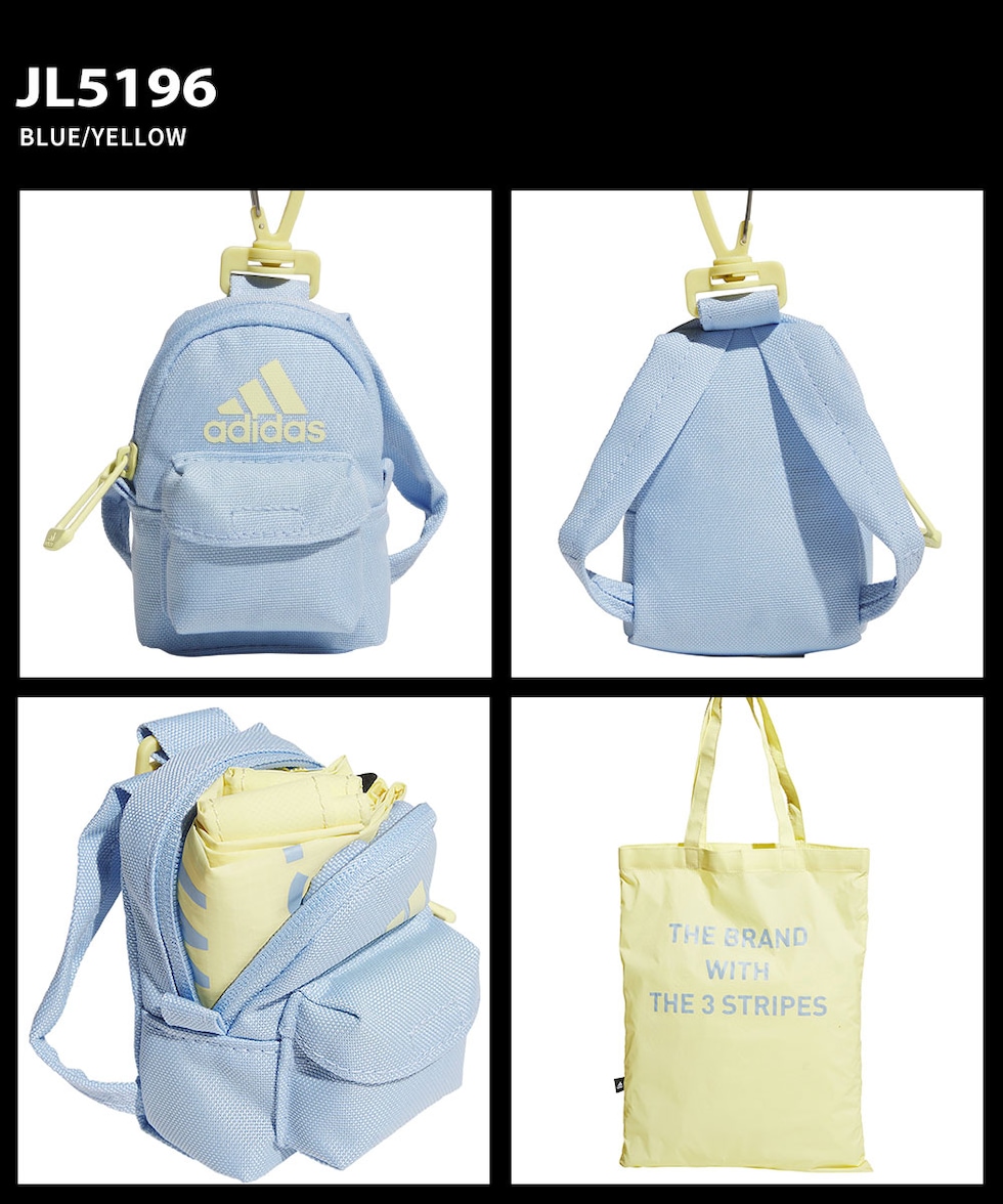 トートバッグには、”THE BRAND WITH THE 3-STRIPES”のコントラストカラーのプリントをあしらい、使わないときはミニバックパックの中にコンパクトに収納できる。