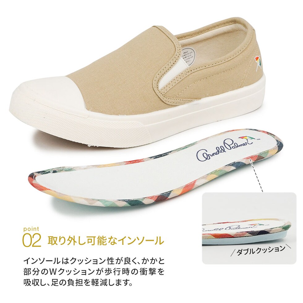 アーノルドパーマー スリッポン レディース 軽量 おしゃれ キャンバスシューズ シンプル 通勤 通学 履きやすい 歩きやすい 通気性 蒸れにくい 疲れにくい ジュニア 学生 靴 ワンポイント 黒 ブラック ホワイト 白 グレー ベージュ イエロー 0732