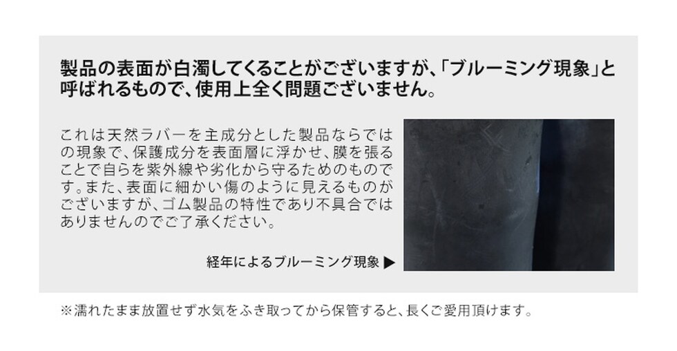 天然ゴムを使用しておりますので、特有の匂いがございますが不良品ではございません。そのため、匂いによる理由での返品、交換等は承ることができませんので予めご了承のうえ、お買い求め下さいませ。