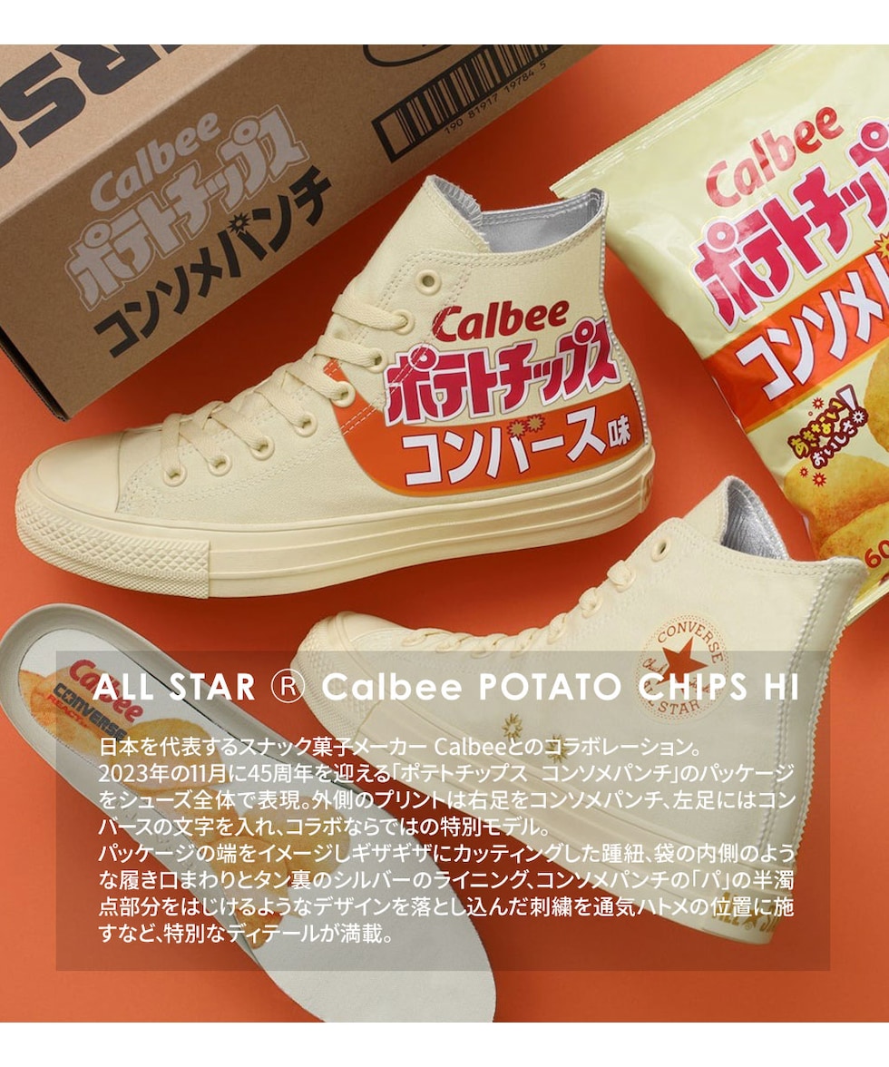 2023年の11月に45周年を迎える「ポテトチップス コンソメパンチ」のパッケージをシューズ全体で表現。外側のプリントは右足をコンソメパンチ、左足にはコンバースの文字を入れ、コラボならではの特別モデル。
