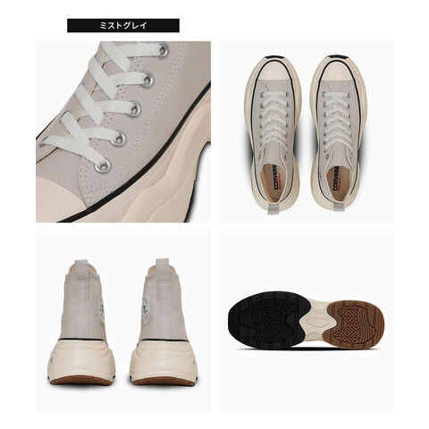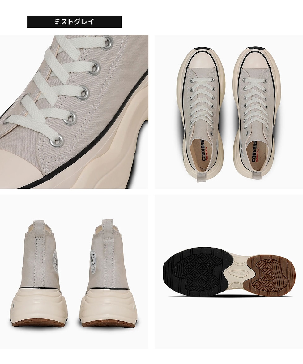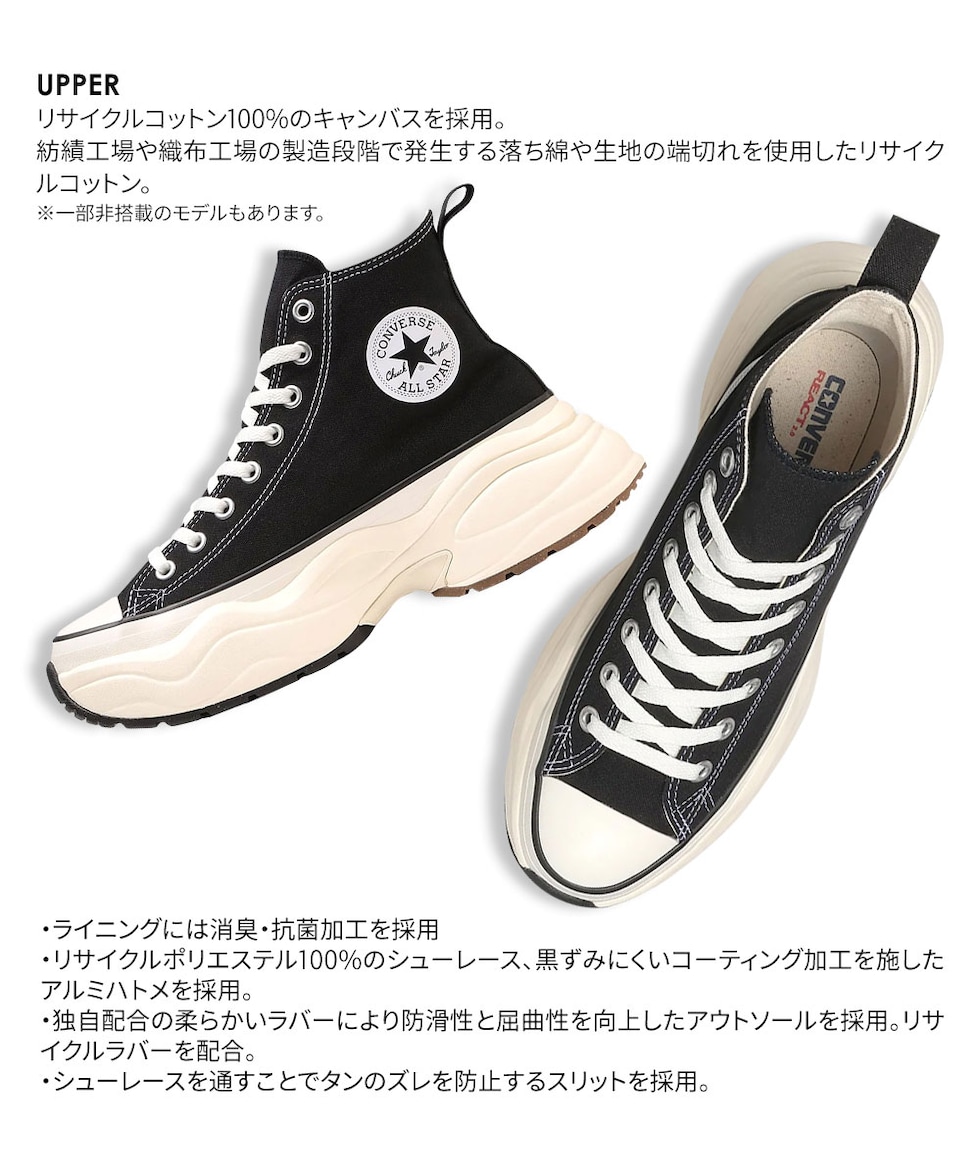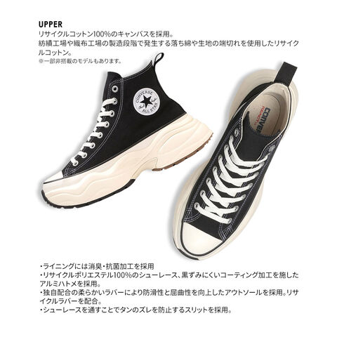 リサイクルマテリアルを随所に使用しつつ、履き心地とクラシックな外観を洗練させたオールスターの次世代モデル、ALL STAR の厚底ソールアレンジモデル。 オールスターと90年代のトレーニングシューズをモチーフにしたボリュームのある厚底ソールを合体し、流線的でレトロスポーティな印象に仕上げたニューモデル。 アッパーにラバーの仮底を付けない設計を採用することでボリュームのあるデザインながら軽量化を実現。 ミッドソールにクッション性に優れるインジェクションE.V.A.を採用することで履き心地も向上。 90年代のレトロスポーティな雰囲気にアレンジした「ALL★STAR」が入ったTPUパーツをミッドソールに付属。