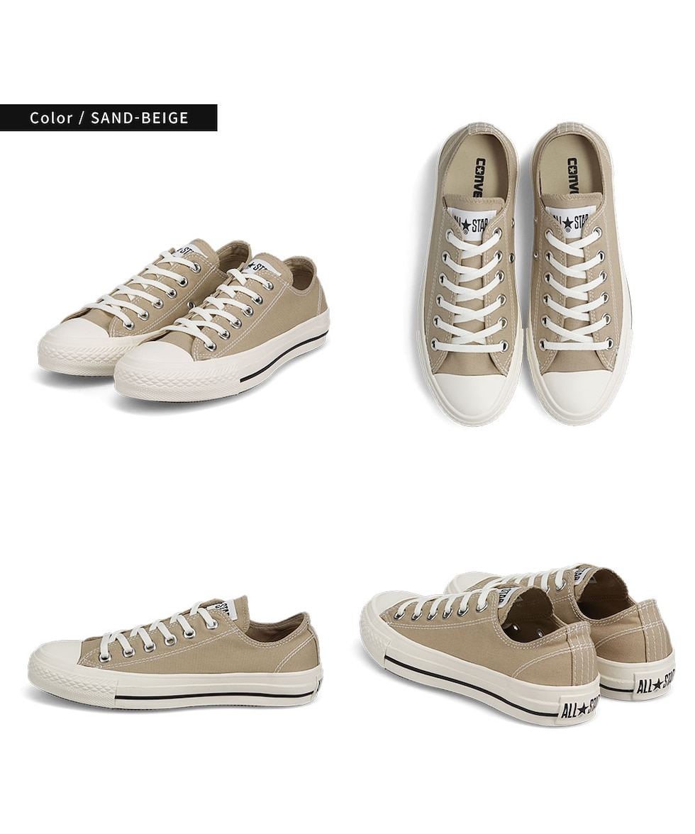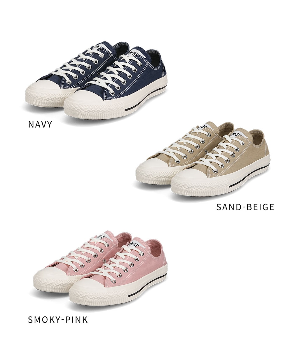 オールスターのディテールアレンジモデル。 通常より広いピッチのステッチ、生成りのテープやシューレースを合わせ、クラシックな印象に仕上げたオールスター。 アッパーと同色のライニングを採用し、カウンターや踵紐にもステッチを付加。 シンプルなデザインで、幅広いスタイリングにすっきり合わせられるアイテム。 スモーキーピンク、ネイビー、サンドベージュの3カラー展開。
