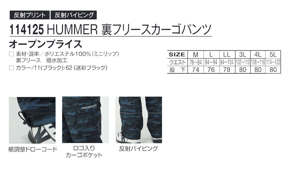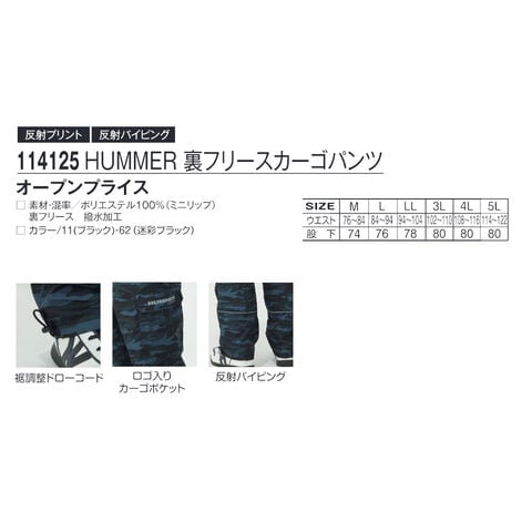 HUMMER 作業服 冬 防寒着 メンズ 作業着 ズボン 秋 防寒 パンツ 防寒パンツ カーゴパンツ ワークパンツ 裏フリース 撥水 黒 迷彩 ハマー アタックベース 114125