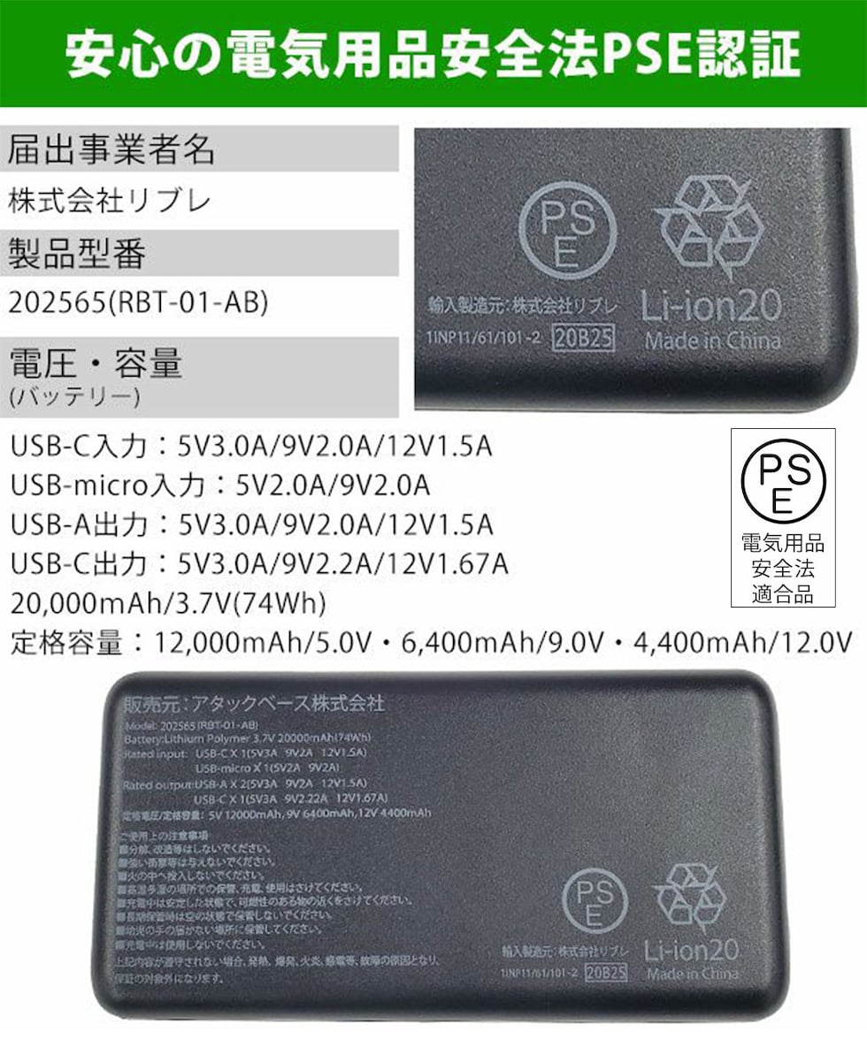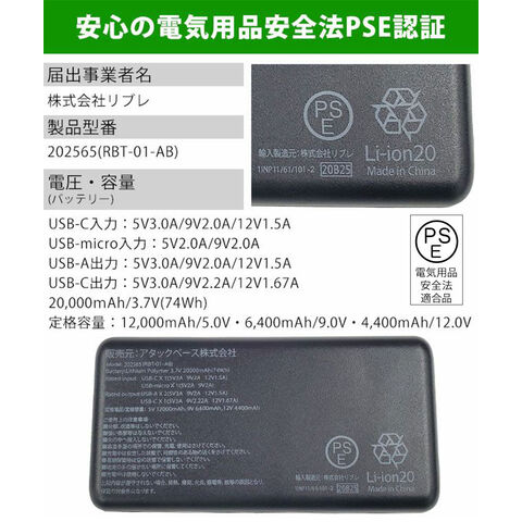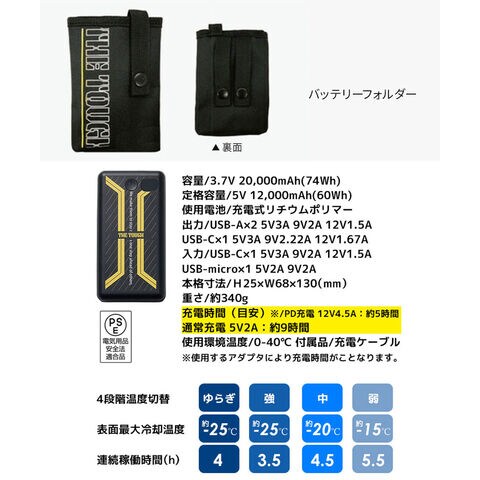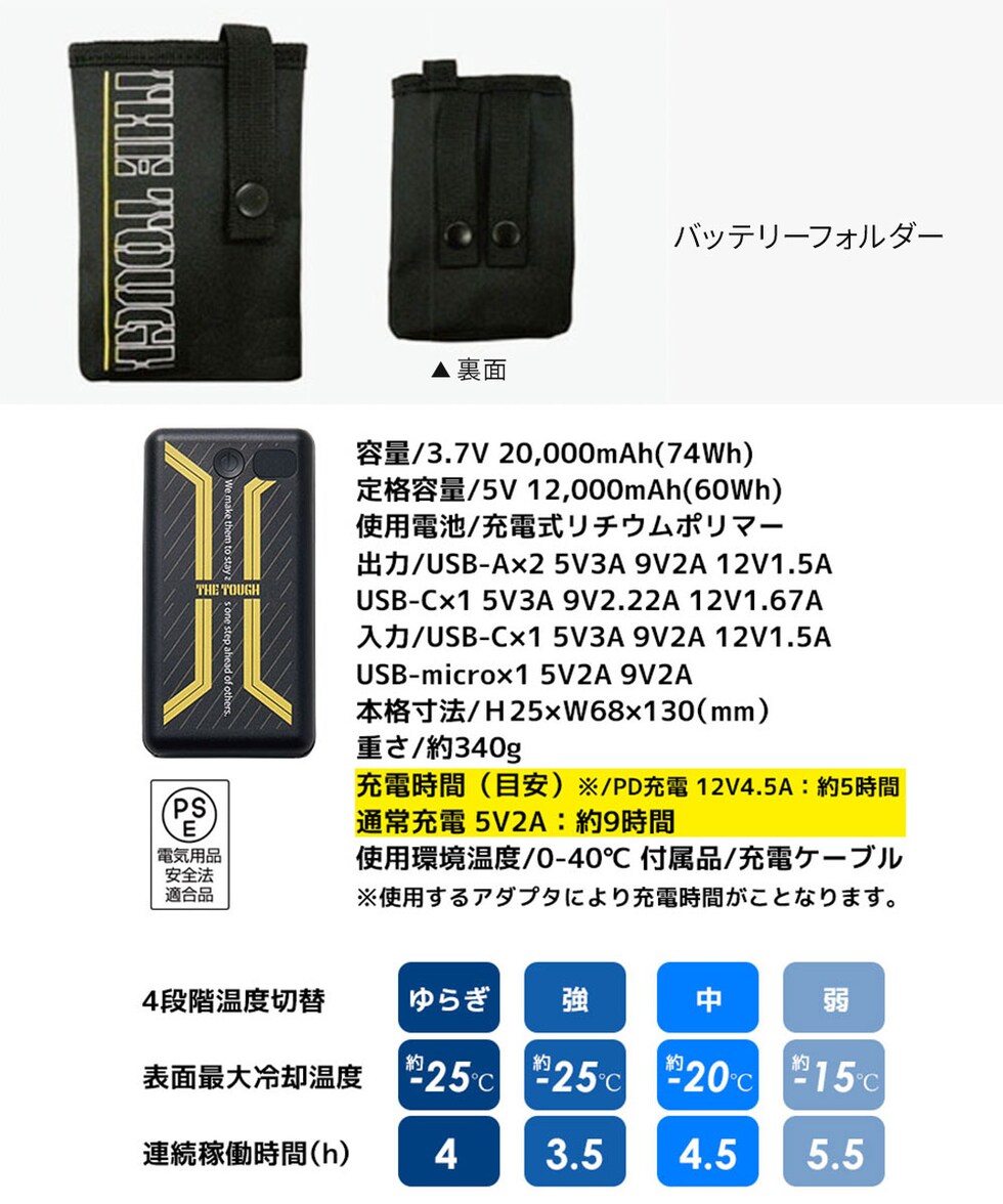 充電時間(目安):PD充電12V/1.5A:約5時間
