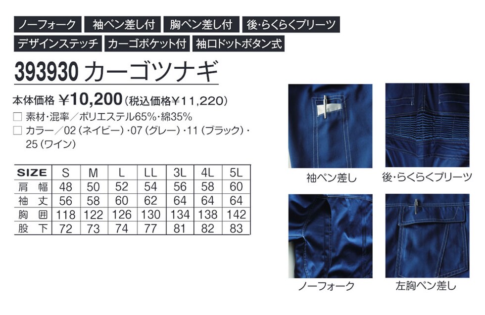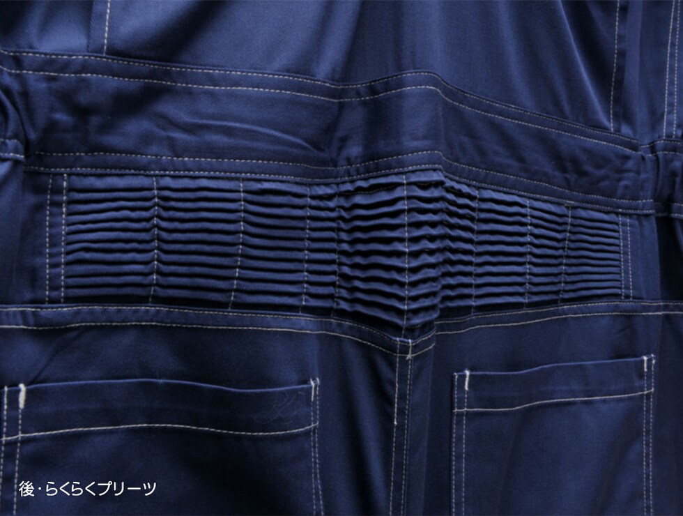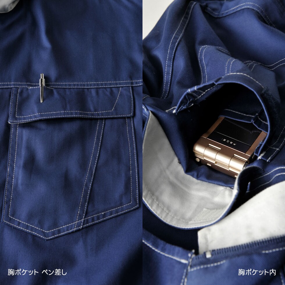 ポリエステル65%・綿35%・ノーフォーク・袖ペン差し・胸ペン差し・後ろらくらくプリーツ・デザインステッチ・カーゴポケット・袖口ドットボタン式
