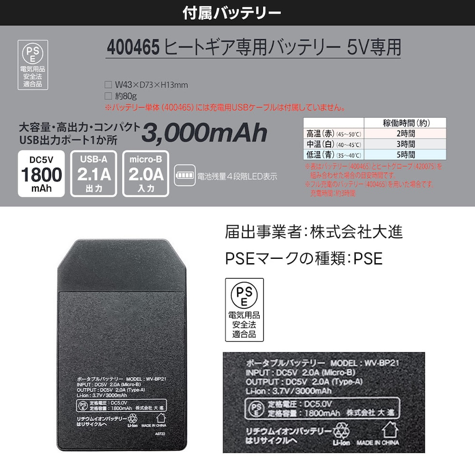 ポリエステル100%・防風素材・カーボンナノチューブ内蔵・手洗い可・シングルスイッチ・5Vミニバッテリー付き