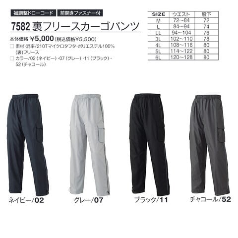 7582 裏フリースカーゴパンツ(裾調整ドローコード・前開きファスナー付き)