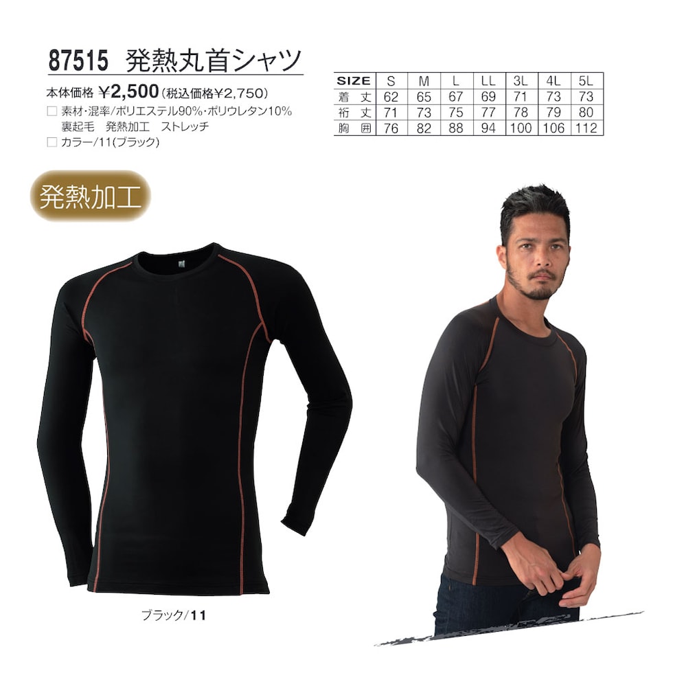87515 発熱丸首シャツ(裏起毛・発熱加工・ストレッチ)