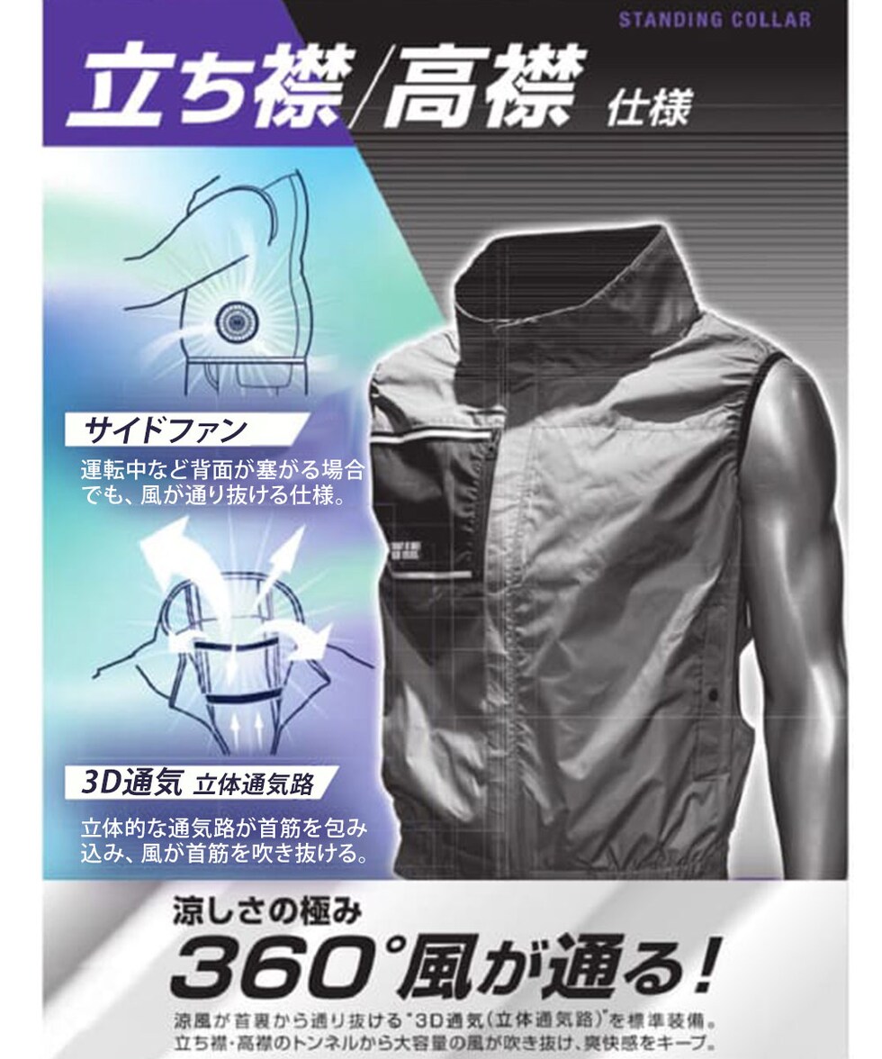 立ち襟/高襟仕様で360度風が通る立体風気路を標準搭載。大容量の風が吹き抜け、爽快感をキープ!