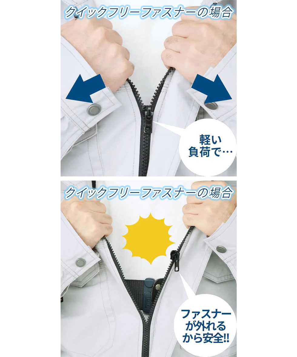 空調風神服(R)は、軽い負担でファスナーが解放されるクイックフリーファスナーを採用。