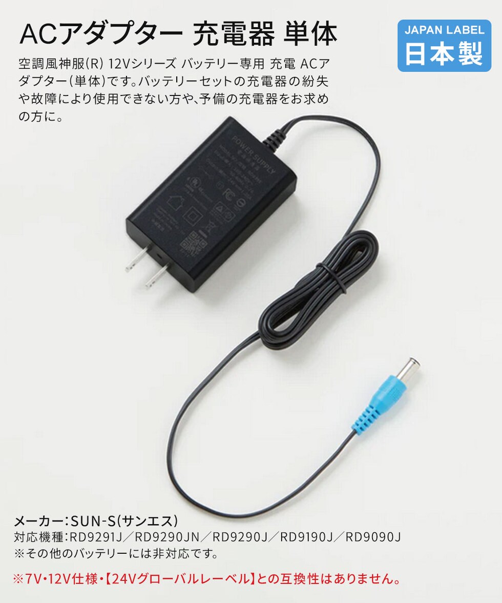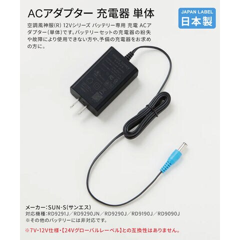 リチウムイオン バッテリー 用 ACアダプター 充電器 単体 12V用 Japan Label 黒 サンエス アタックベース EFウェア 空調風神服