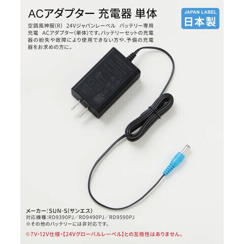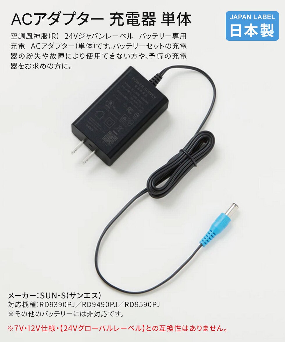 リチウムイオン バッテリー 用 ACアダプター 24V用 充電器 単体 Japan Label 黒 SUN-S サンエス アタックベース 空調風神服
