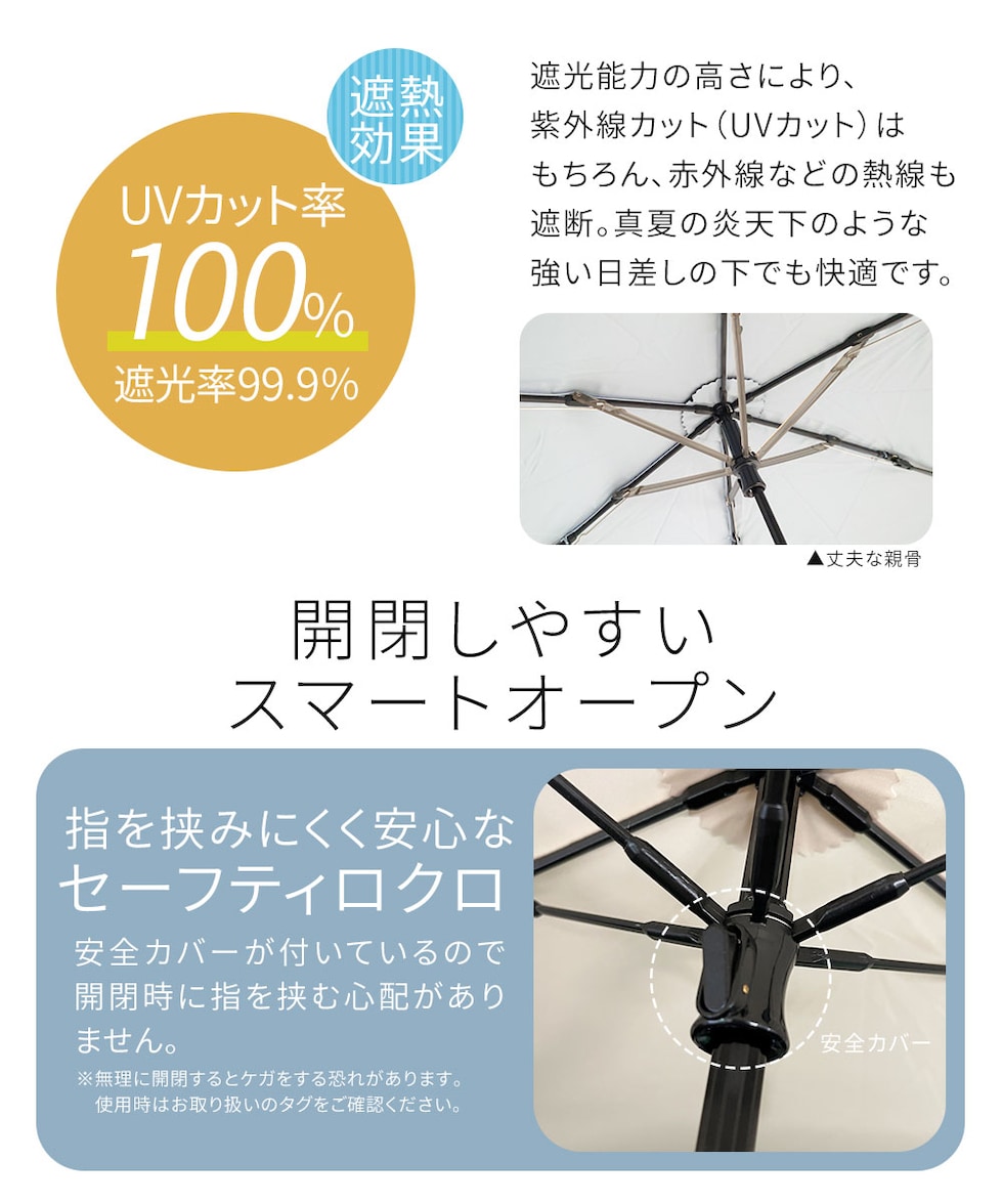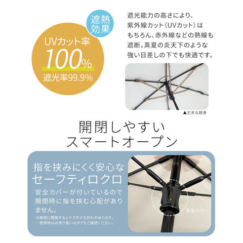 遮光能力の高さにより、紫外線カット(UVカット)はもちろん、赤外線などの熱線も遮断するため、真夏の炎天下のような強い日差しの下でもより快適に過ごすことができます。