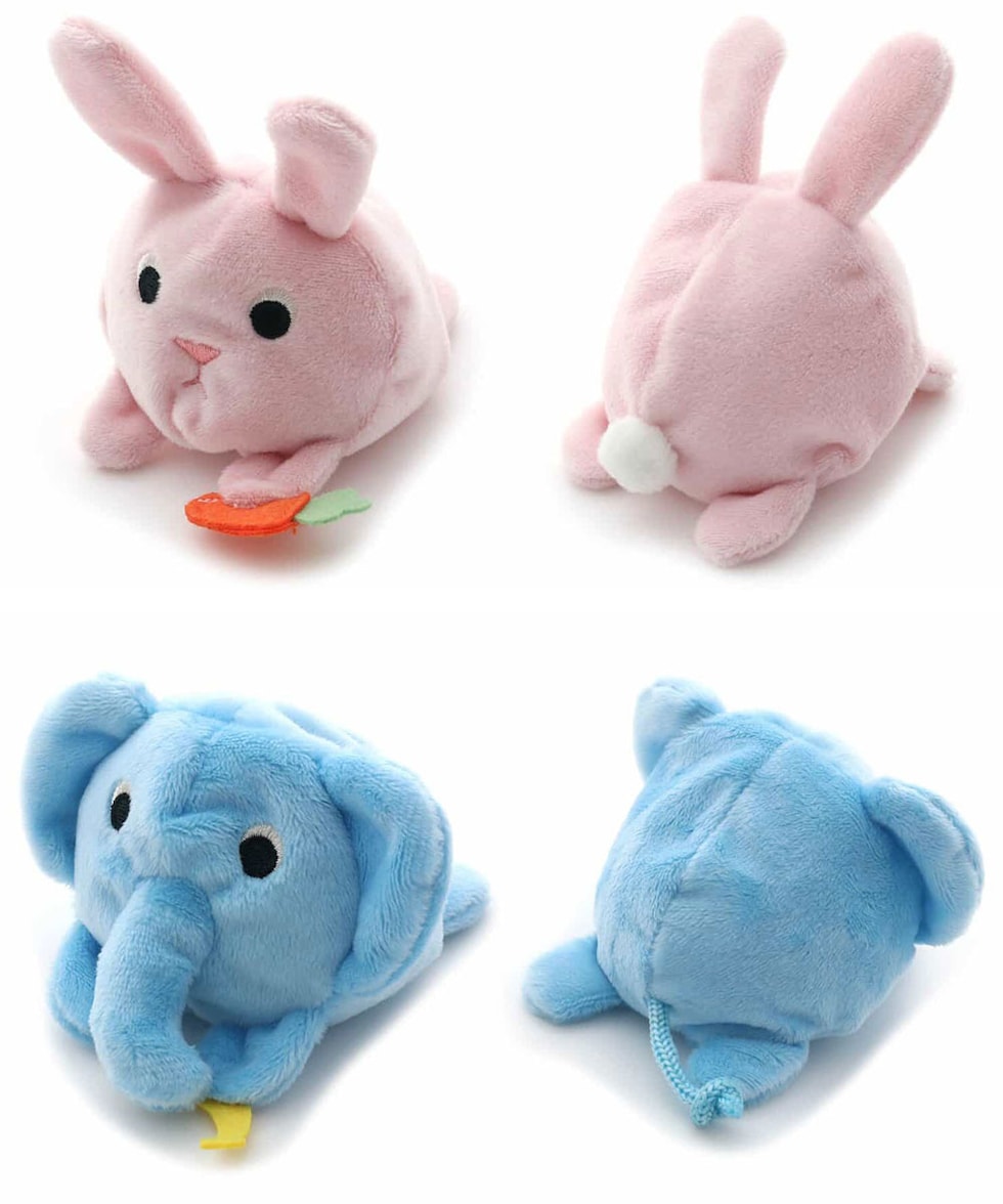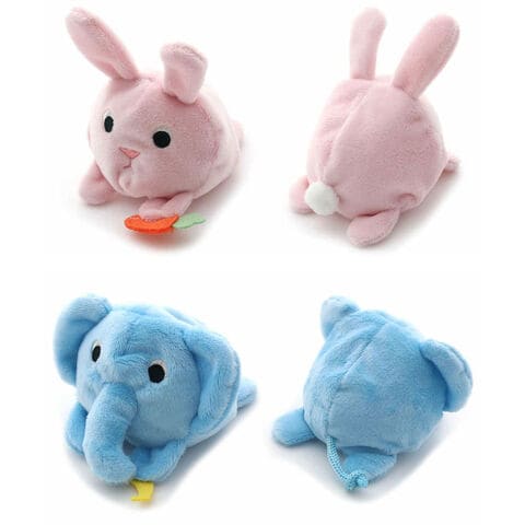 それぞれ手にごはんを持っているクマ、ウサギ、ライオン、ゾウのアニマルお手玉セット。