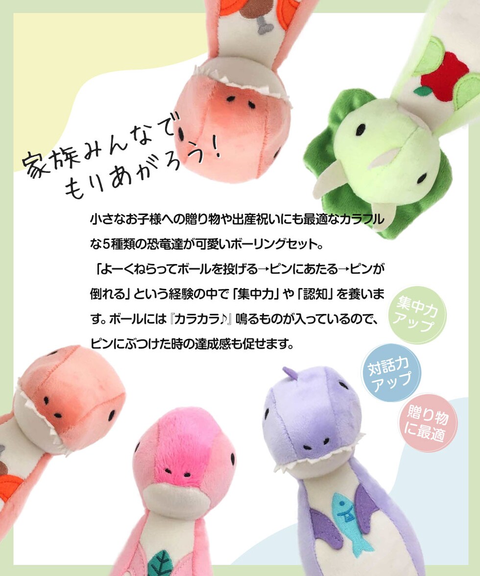 小さなお子様への贈り物や出産祝いにも最適なカラフルな5種類の恐竜達が可愛いボーリングセット!