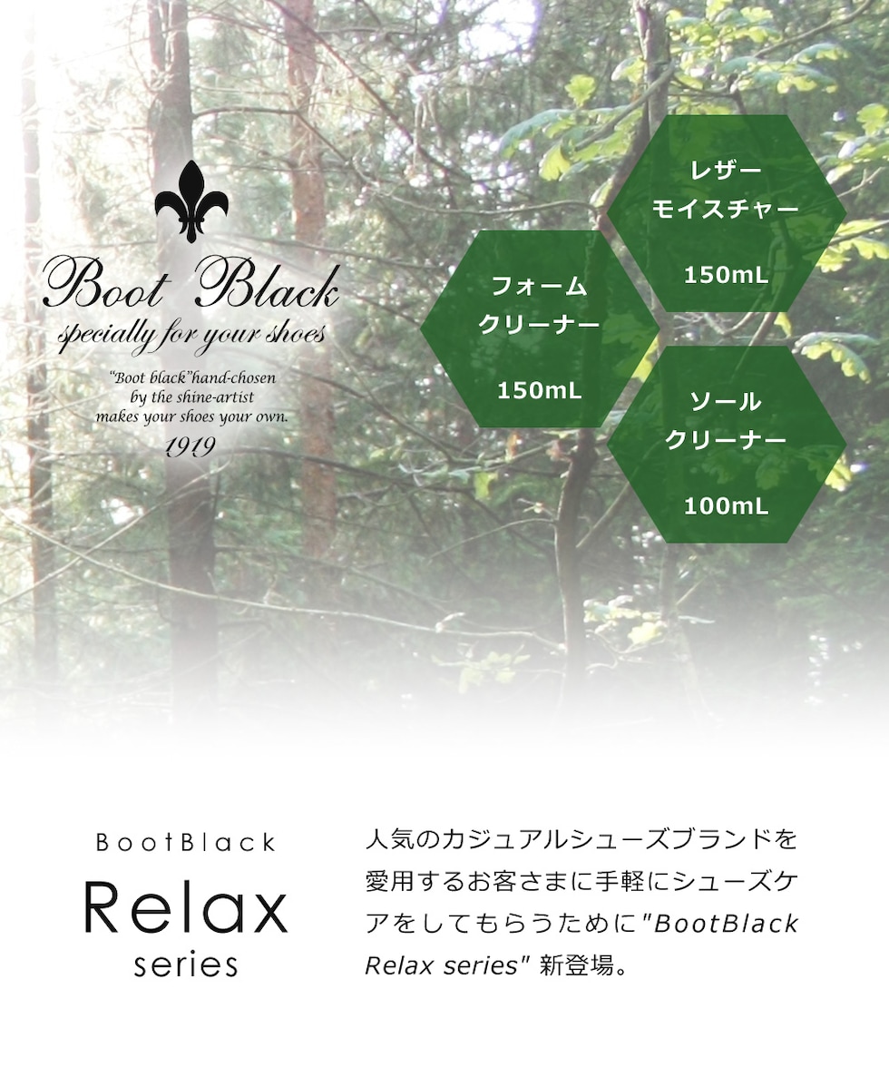 靴がその存在感を主張し始めた昨今、お客様一人一人のご要望を具体化し、オリジナルな靴を作り上げるために活動しているコロンブス"トップシャイニスト"の独自の判断基準を採用し、「磨きのプロ達」が創りあげた、それが"BootBlack"シリーズです。そして、人気のカジュアルシューズブランドを愛用するお客さまに手軽にシューズケアをしてもらうために"BootBlack Relax series" 新登場。