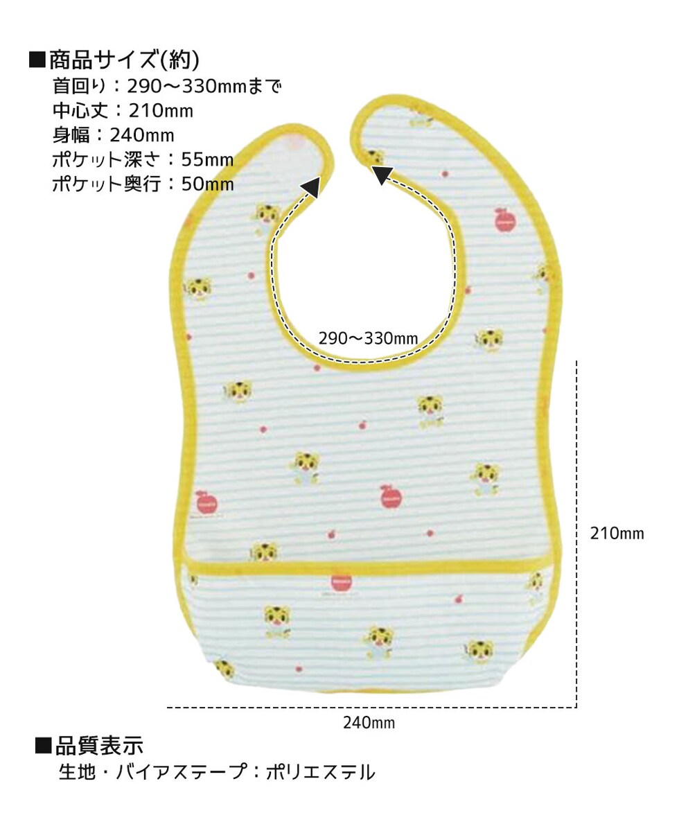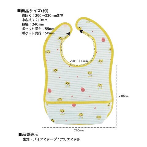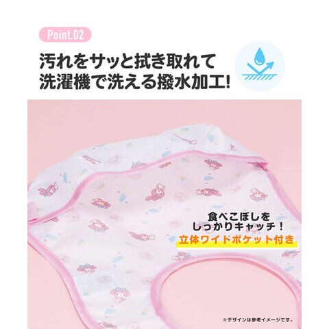 食べこぼしをしっかりキャッチする立体ワイドポケット付き。