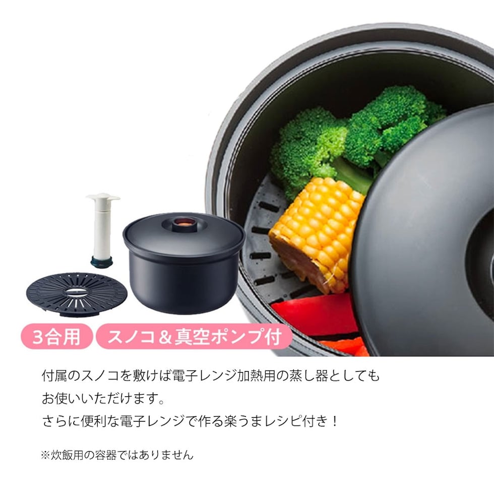 おひつ 真空保存 3合 残りご飯 レシピ付き お櫃 容器 入れ物 スノコ付き レンジ 蒸し器 キッチン用品 節約 電子レンジ 食洗器 黒 BOH3