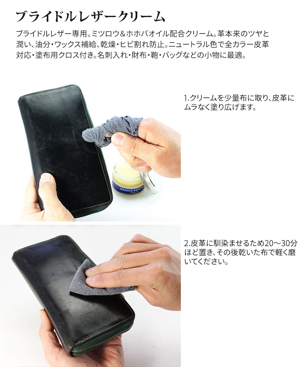 ■使用方法 1.クリームを少量布に取り、皮革にムラなく塗り広げます。