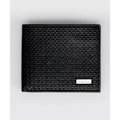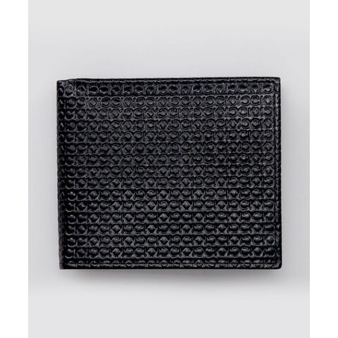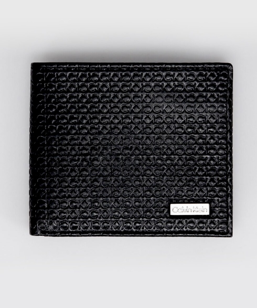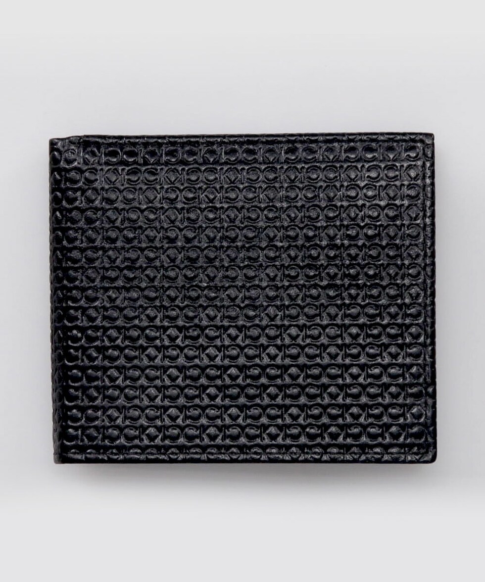 ブランドイニシャル型押しデザインの二つ折り財布。