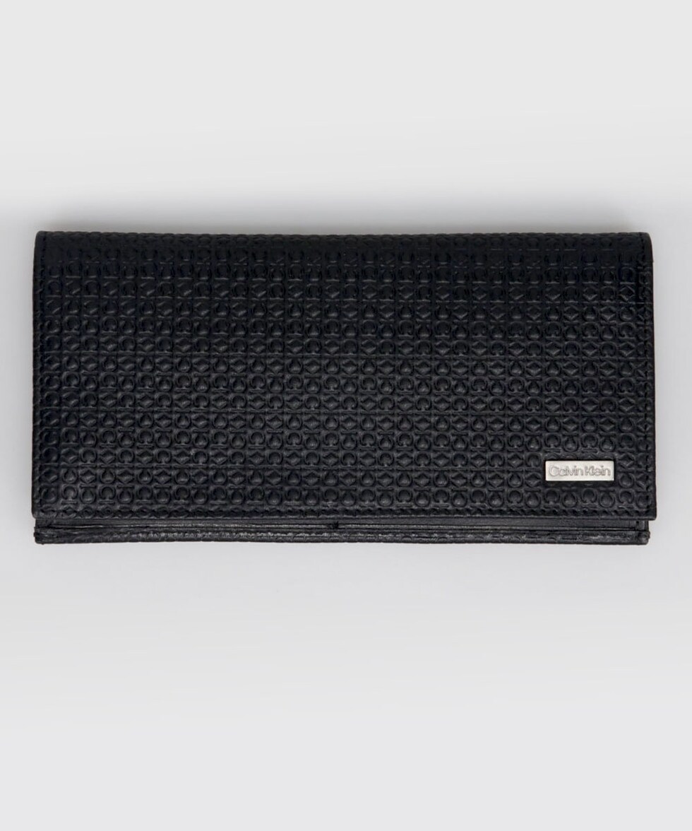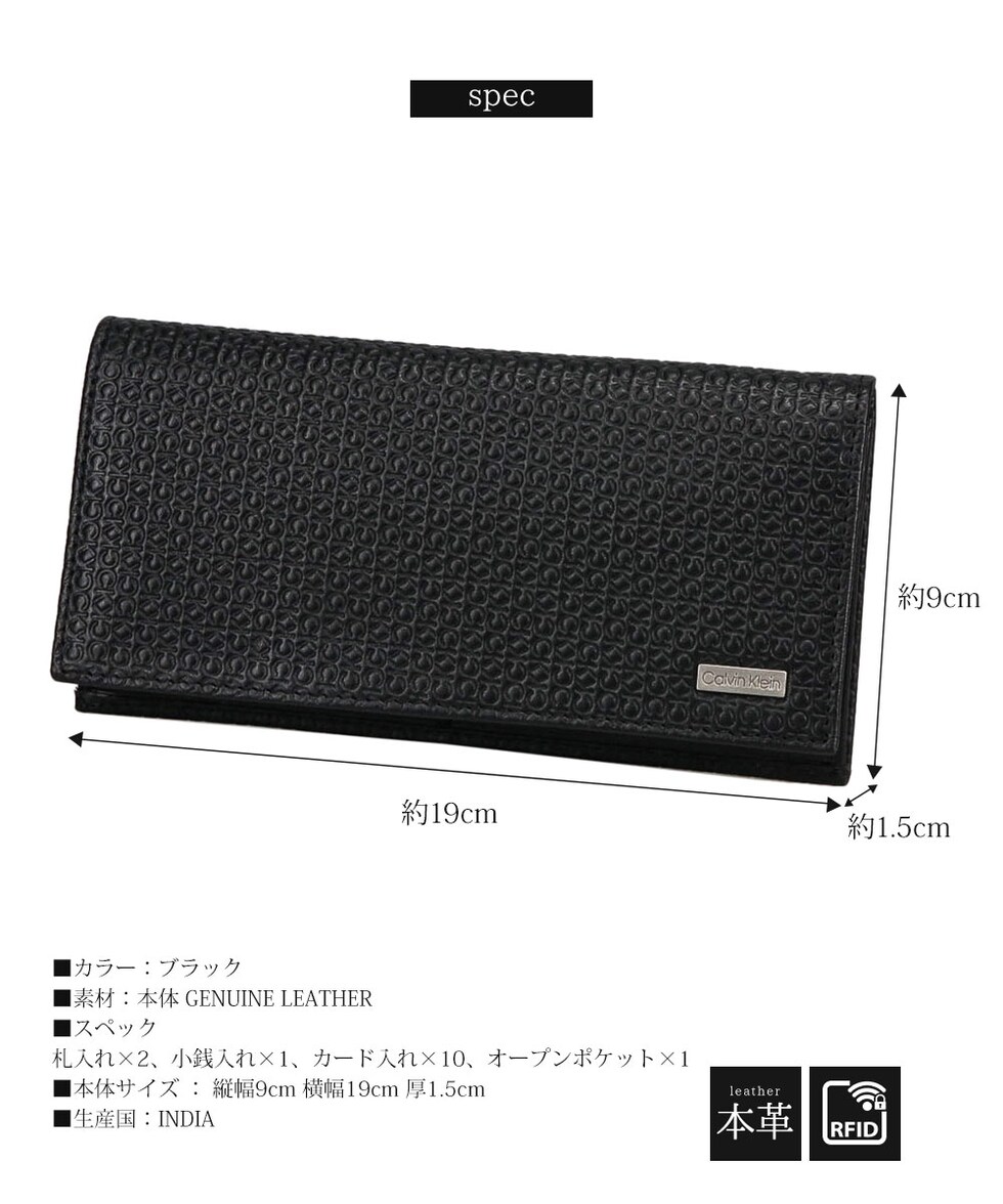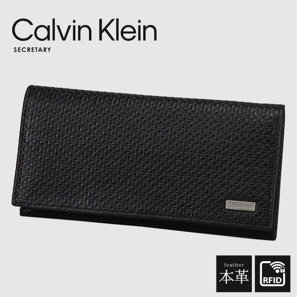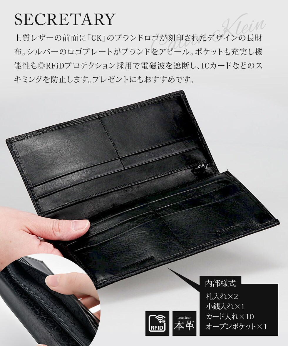 上質レザーの前面に「CK」のブランドロゴが刻印されたデザインの長財布。