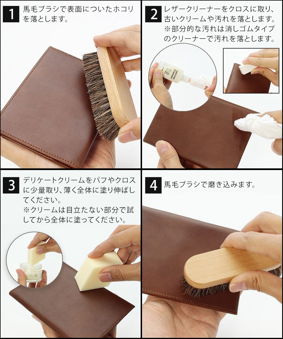 ツヤ革のバッグや財布などのお手入れに必要な7アイテムをセットにしました。