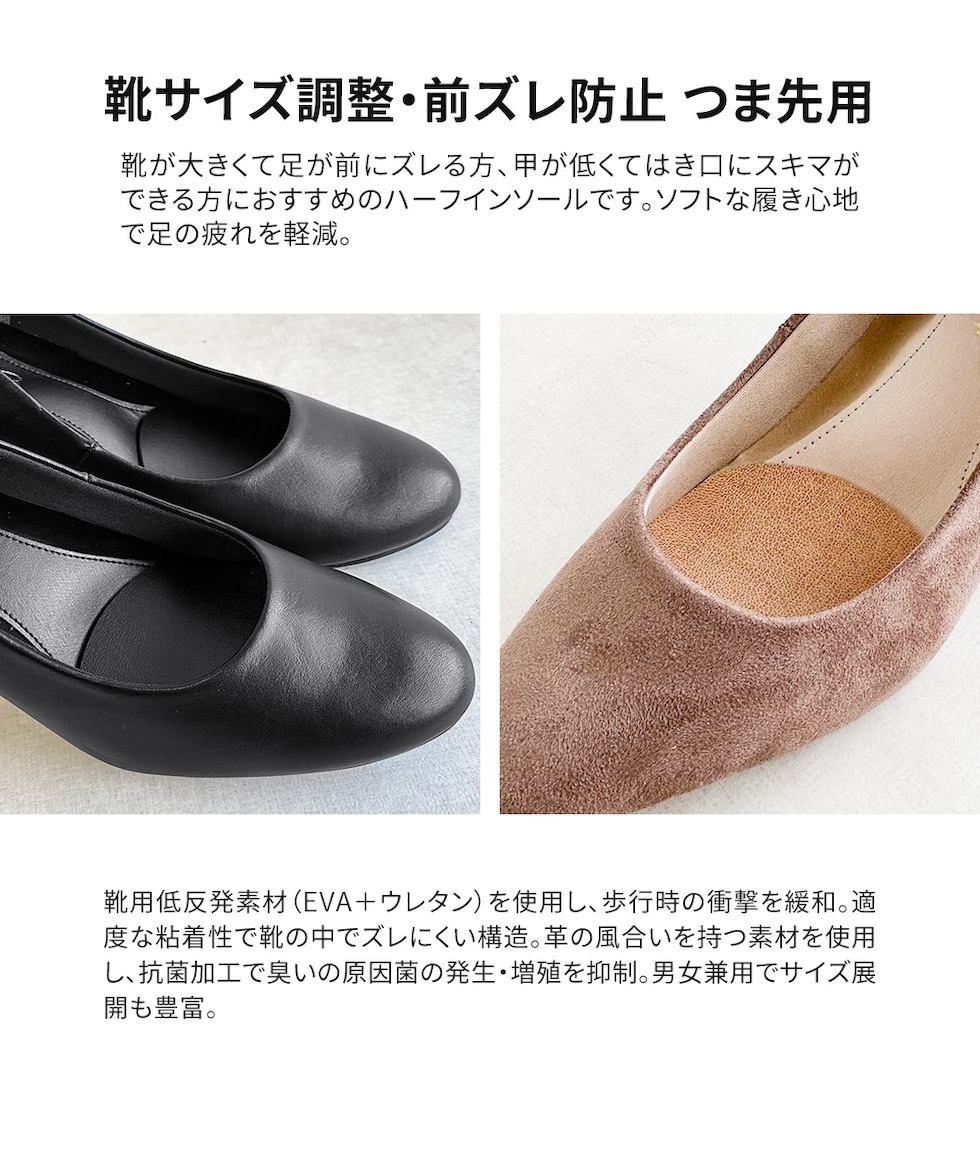 靴が大きくて足が前にズレる方、甲が低くてはき口にスキマができる方におすすめのハーフインソールです。