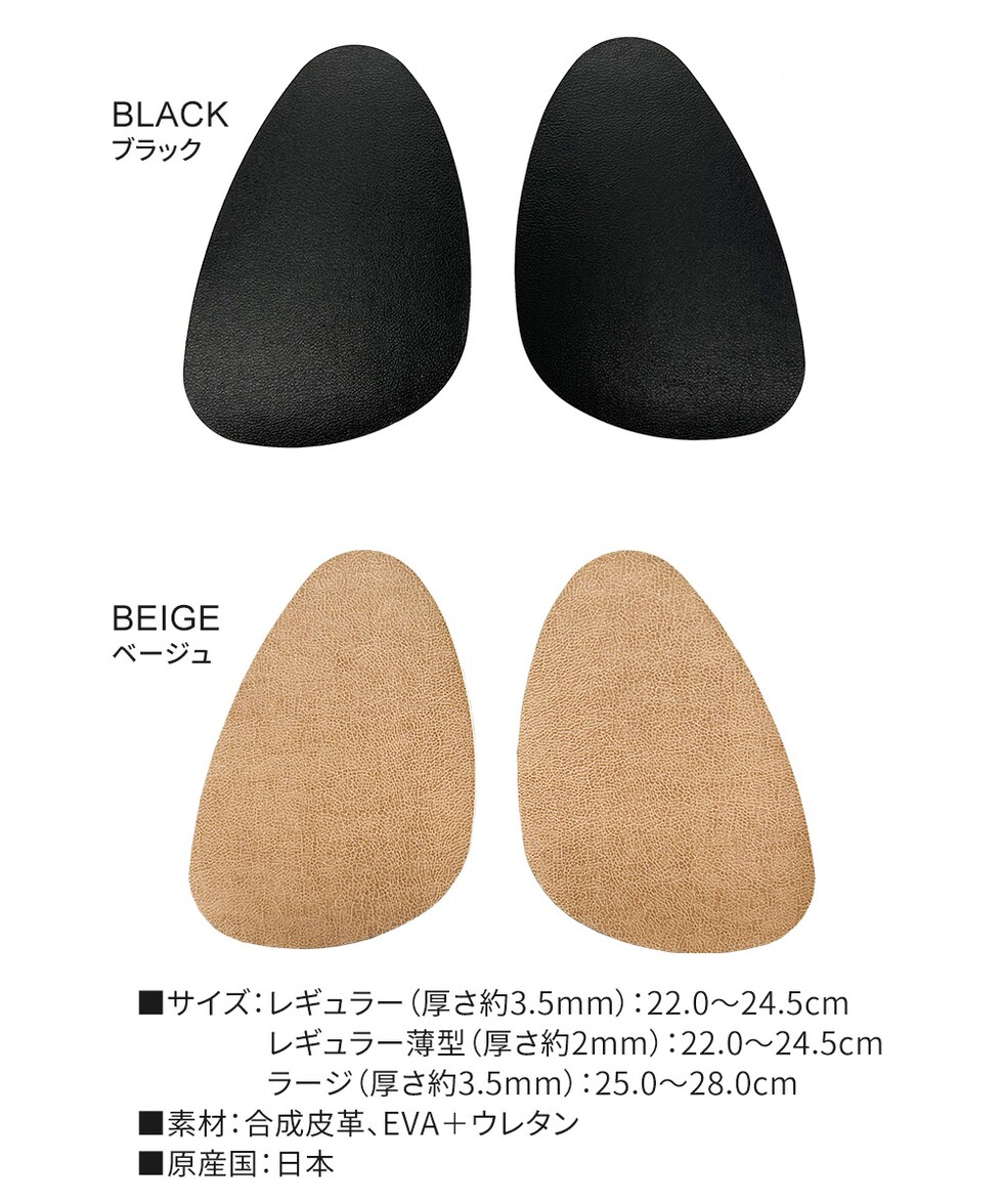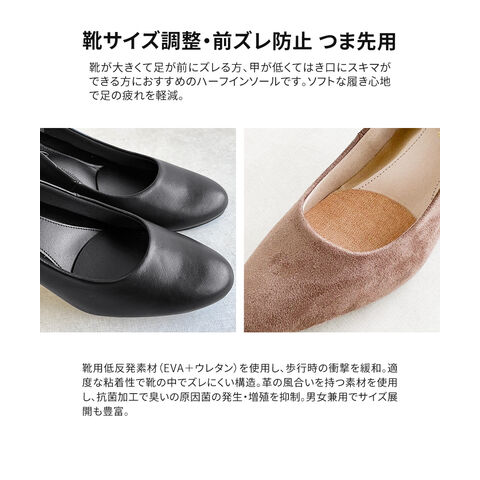 靴サイズ調整 インソール つま先用 男女兼用 靴が大きい 前ズレ防止 衝撃吸収 疲労軽減 抗菌加工 革風素材 EVA ウレタン 低反発素材 滑り止め 洗濯不可 日本製 レギュラー ラージ 薄型 クロ ベージュ スエード 快適フィット 靴中敷き 靴のスキマ調整 甲低い対策 靴のフィット感改善