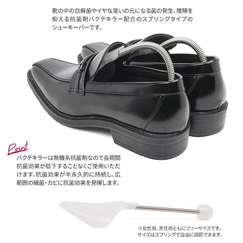 靴の中の白癬菌やイヤな臭いの元になる菌の発生、増殖を抑える抗菌剤バクテキラー配合の、スプリングタイプのシューキーパーです。