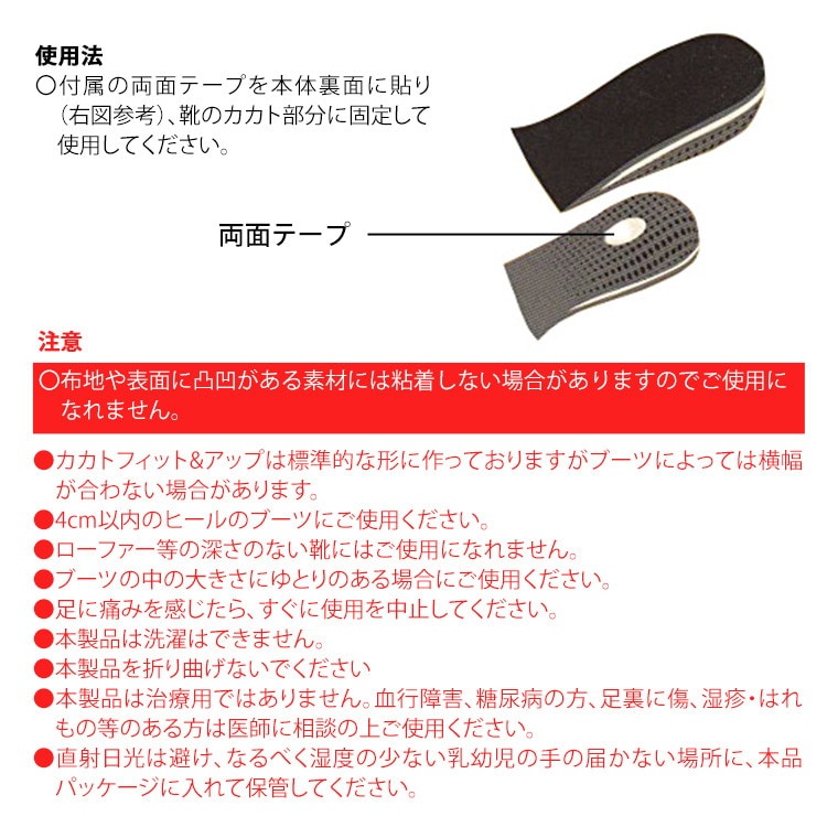 付属の両面テープを本体裏面に貼り、靴のカカト部分に固定して使用してください。