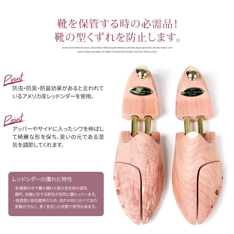 防虫・防臭・防菌効果があると言われているアメリカ産レッドシダーを使用した、ツインチューブタイプのシューツリーです。