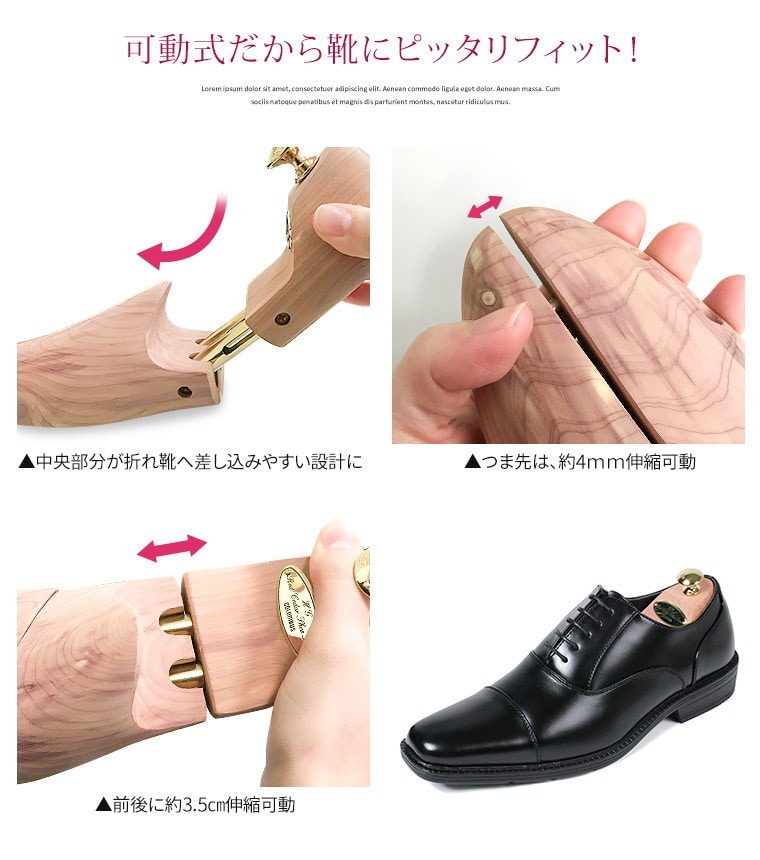 木製シューキーパーはアッパーやサイドに入ったシワを伸ばして綺麗な形を保ち、臭いの元である湿気を調節してくれます。