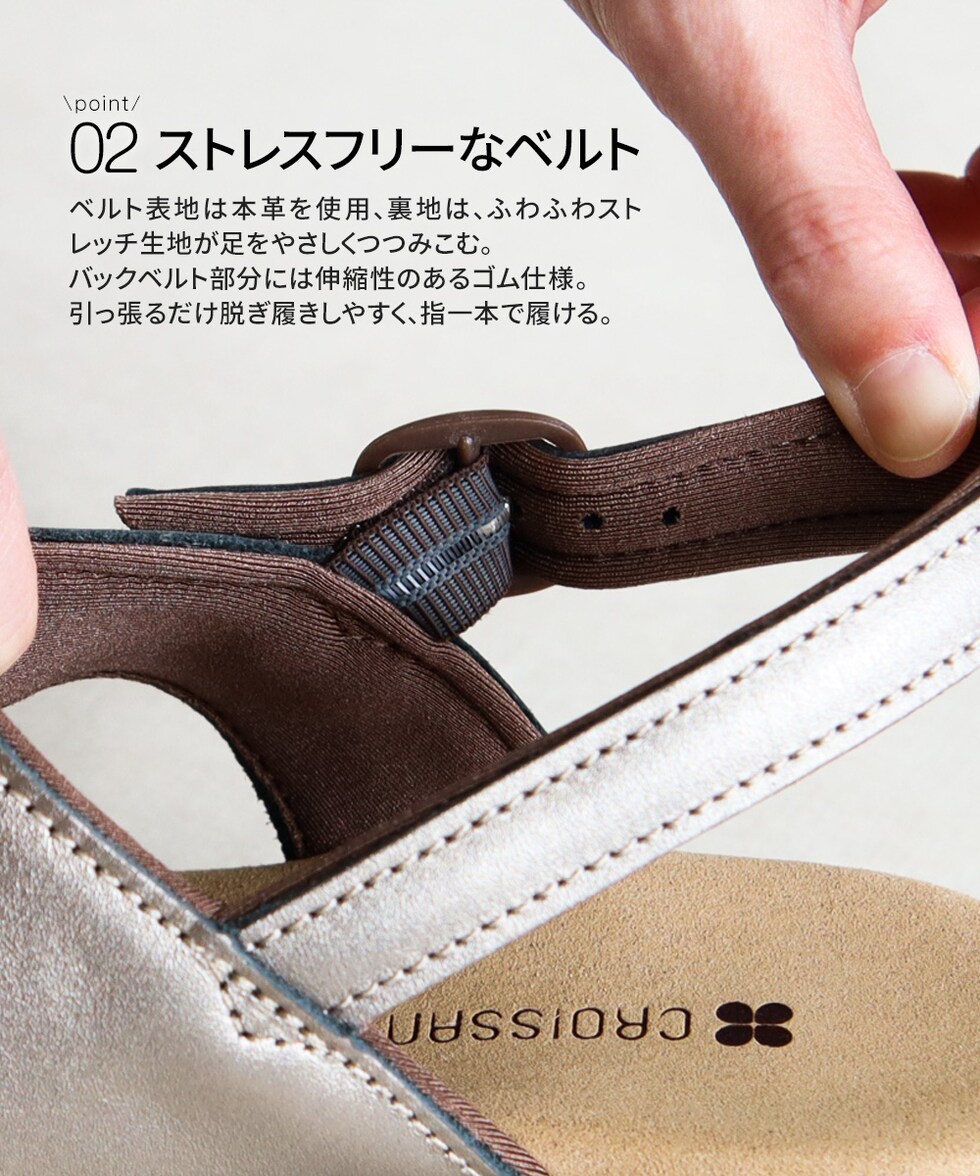 ベルト表地は本革を使用、裏地は、ふわふわストレッチ生地が足をやさしくつつみこむ。