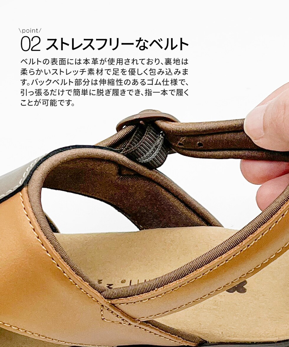 ベルトの表面には本革が使用されており、裏地は柔らかいストレッチ素材で足を優しく包み込みます。バックベルト部分は伸縮性のあるゴム仕様で、引っ張るだけで簡単に脱ぎ履きでき、指一本で履くことが可能です。