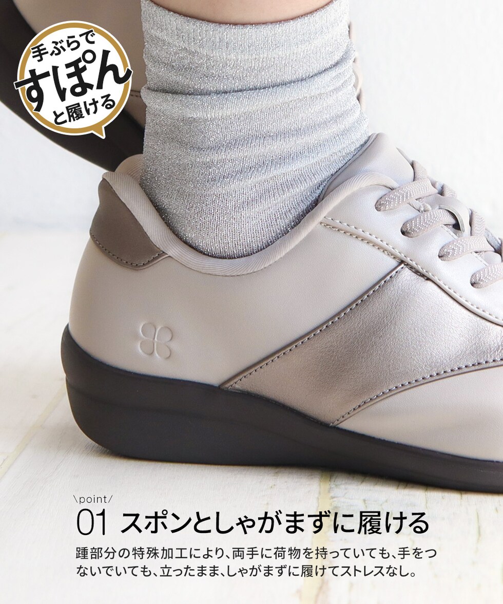 踵部分の特殊加工により、両手に荷物を持っていても、手をつないでいても、立ったまま、しゃがまずに履けてストレスなし。