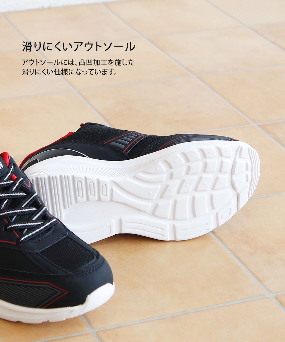 スリッポン(ゴムひも仕様)で脱ぎ履きらくらく。