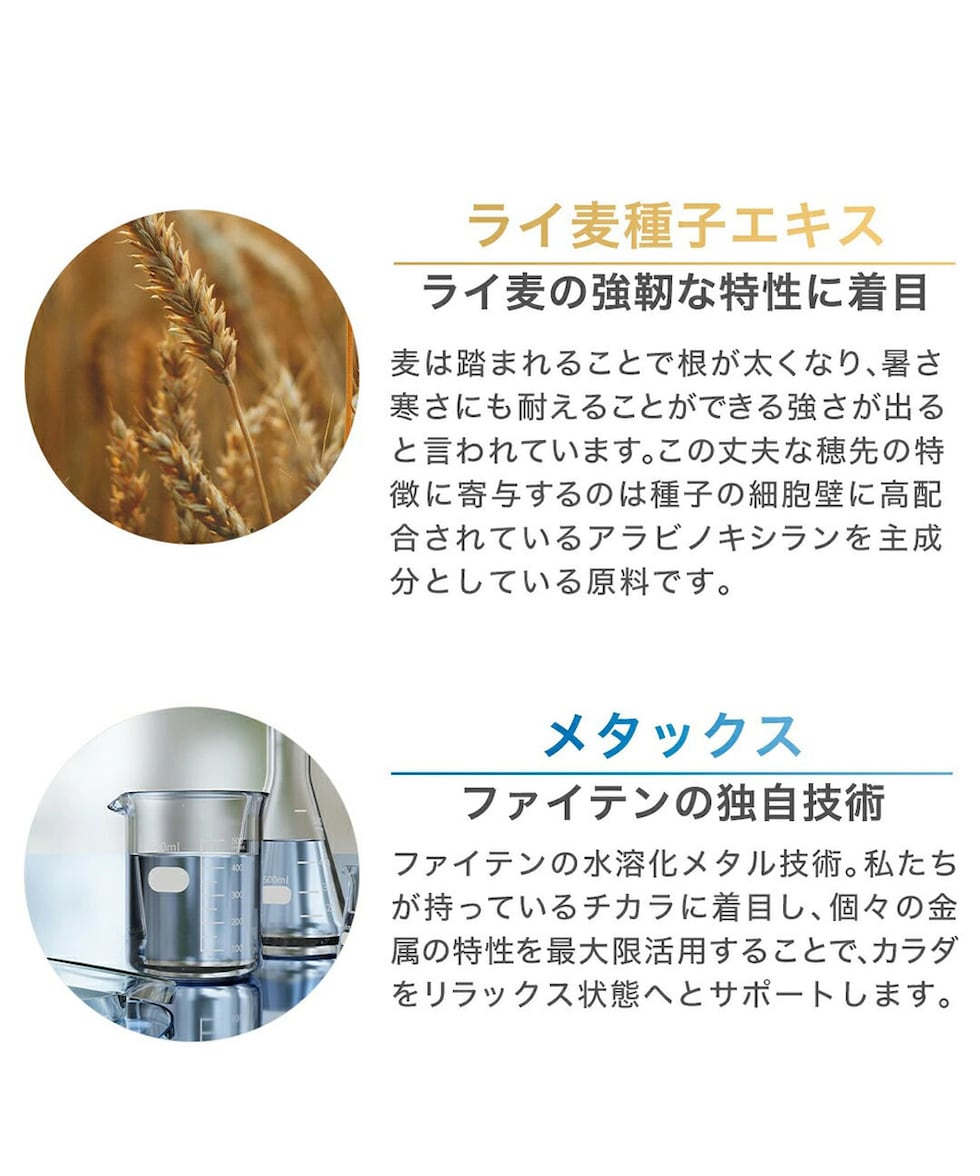 光を味方に、セルフケアが進化する光活性成分「スピルリナマキシマエキス」、種子の細胞壁に高配合されているアラビノキシランを主成分とした「ライ麦種子エキス」を配合。