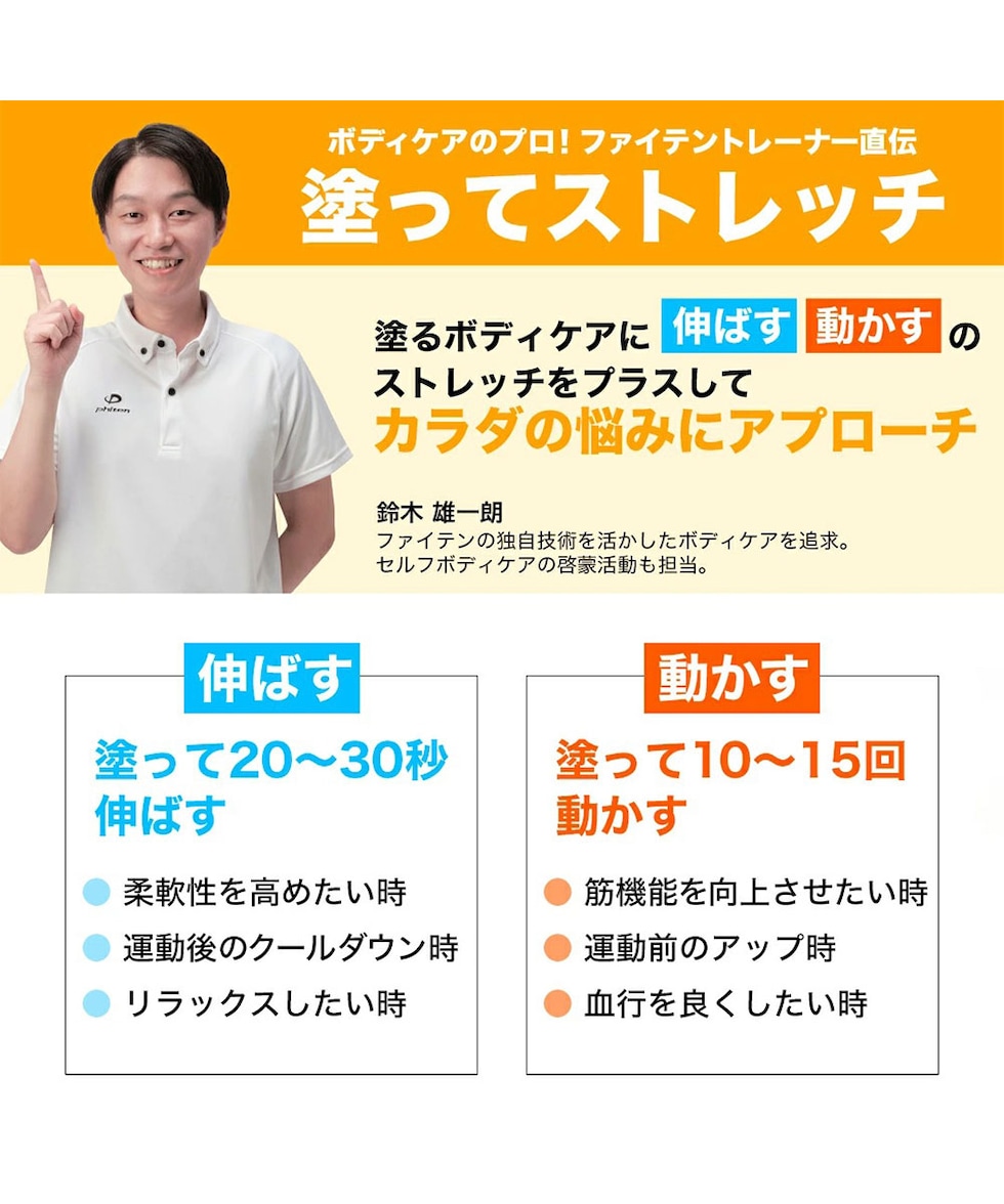 疲れやすい部分やコリを感じる箇所に塗り、その後ストレッチをすることで、成分が肌にスムーズに浸透し、心地よいリフレッシュ感をもたらします。