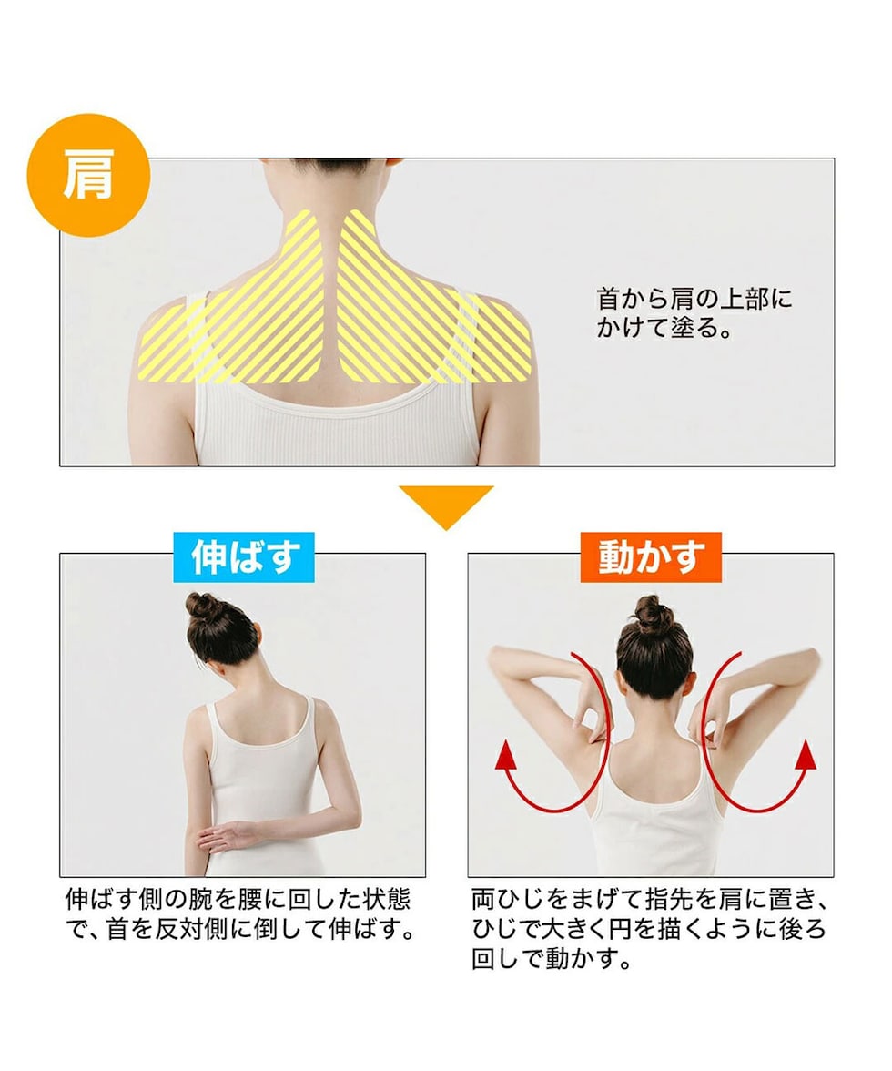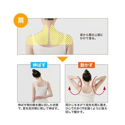 疲れやすい部分やコリを感じる箇所に塗り、その後ストレッチをすることで、成分が肌にスムーズに浸透し、心地よいリフレッシュ感をもたらします。