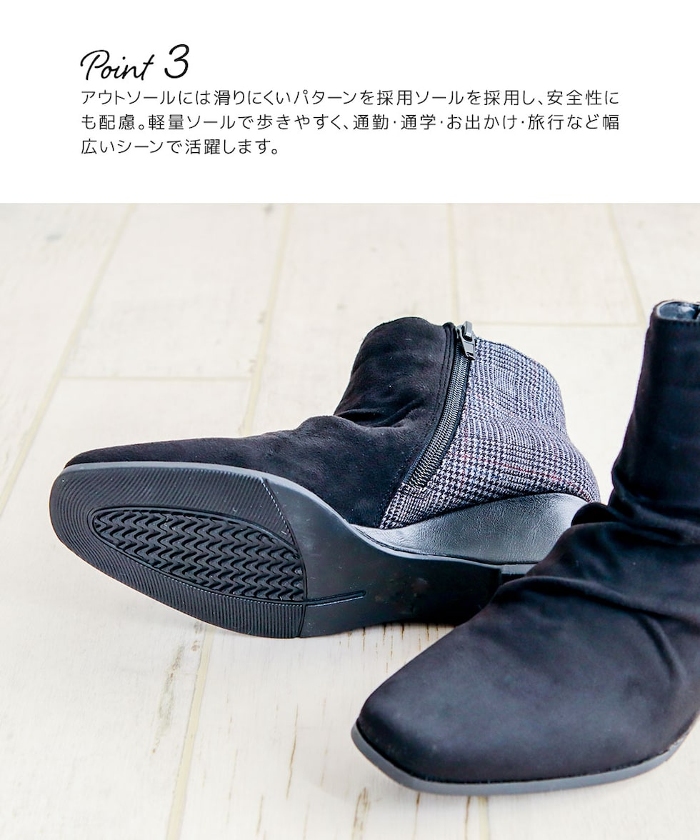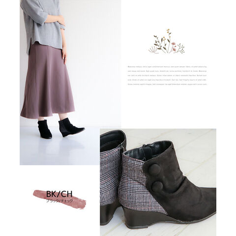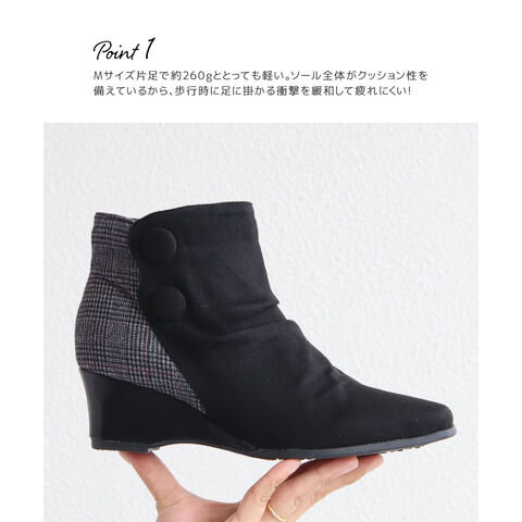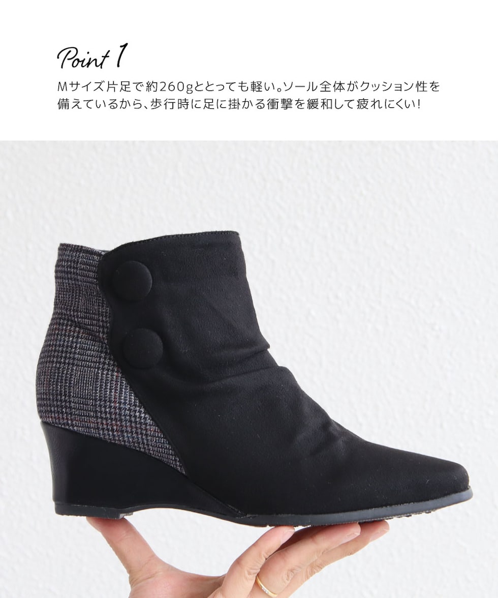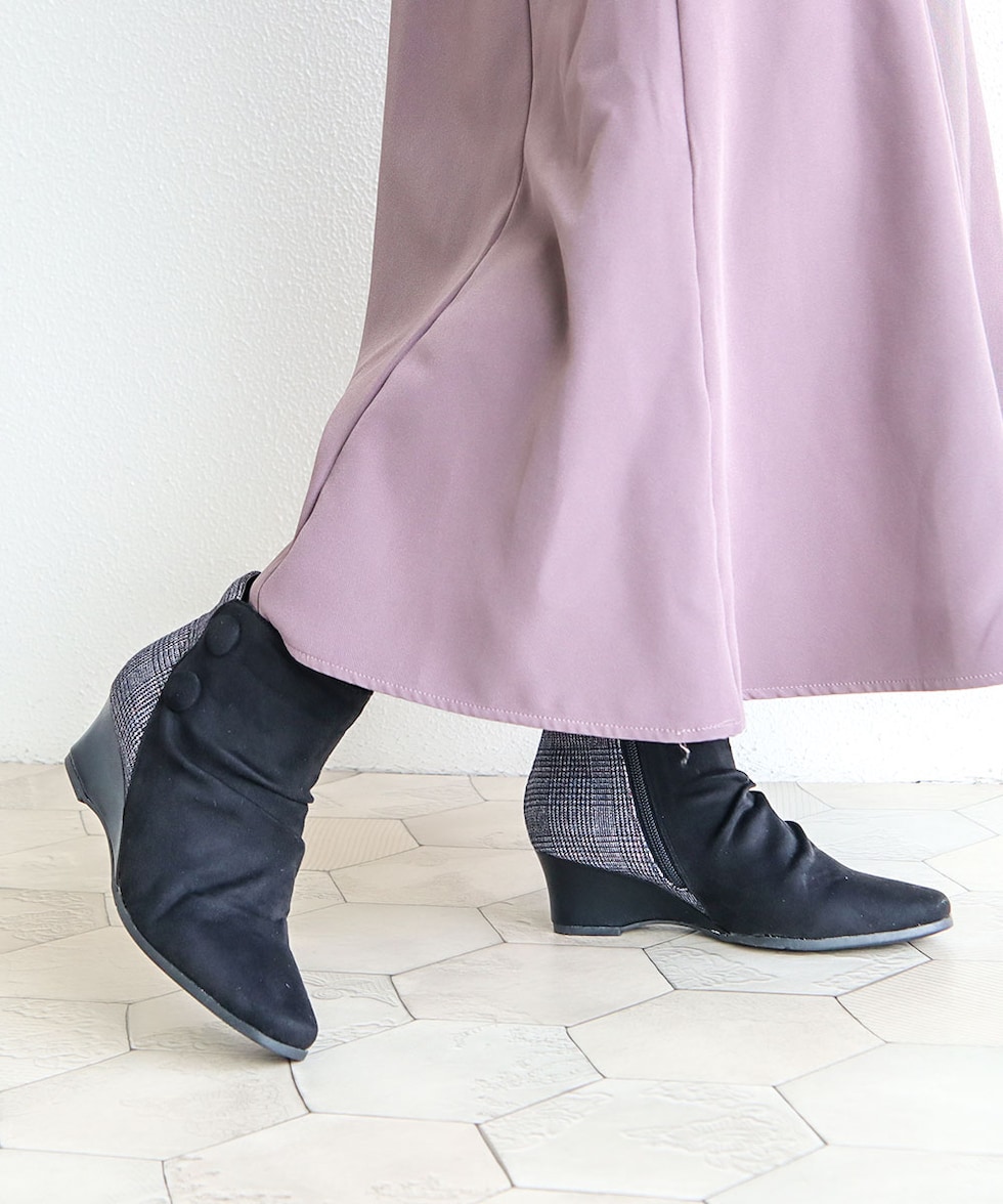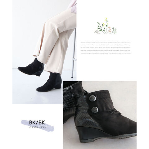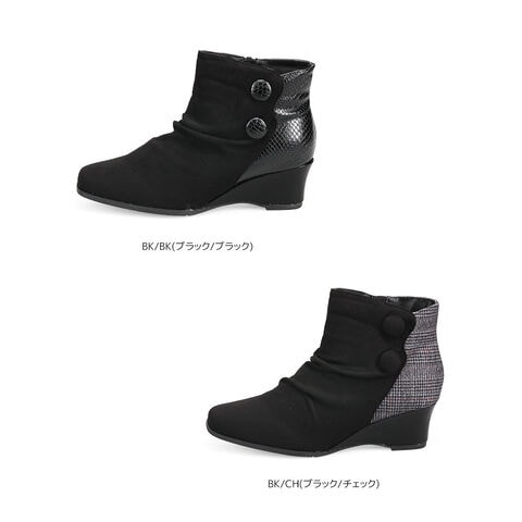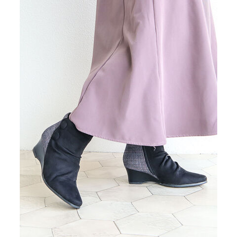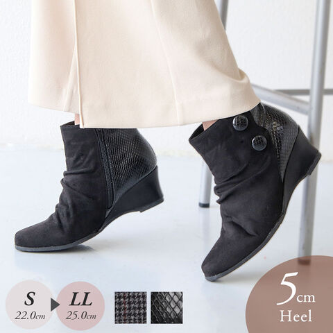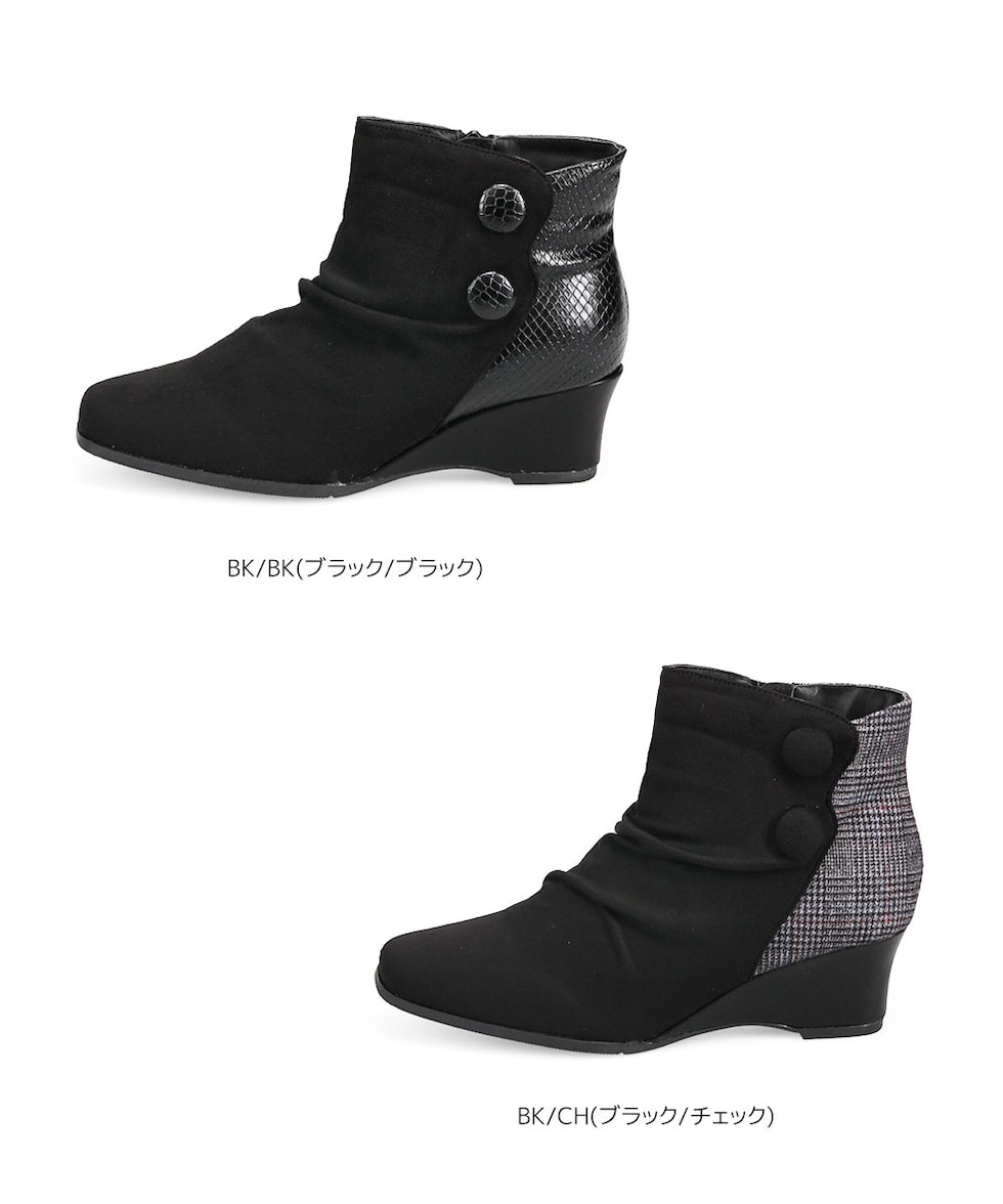 ショートブーツ レディース 歩きやすい スエード調 スクエアトゥ くるみボタン 5cmウェッジヒール ファスナー付き 軽量 痛くない 美脚 黒 秋冬 6042
