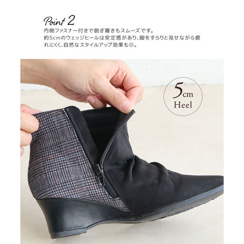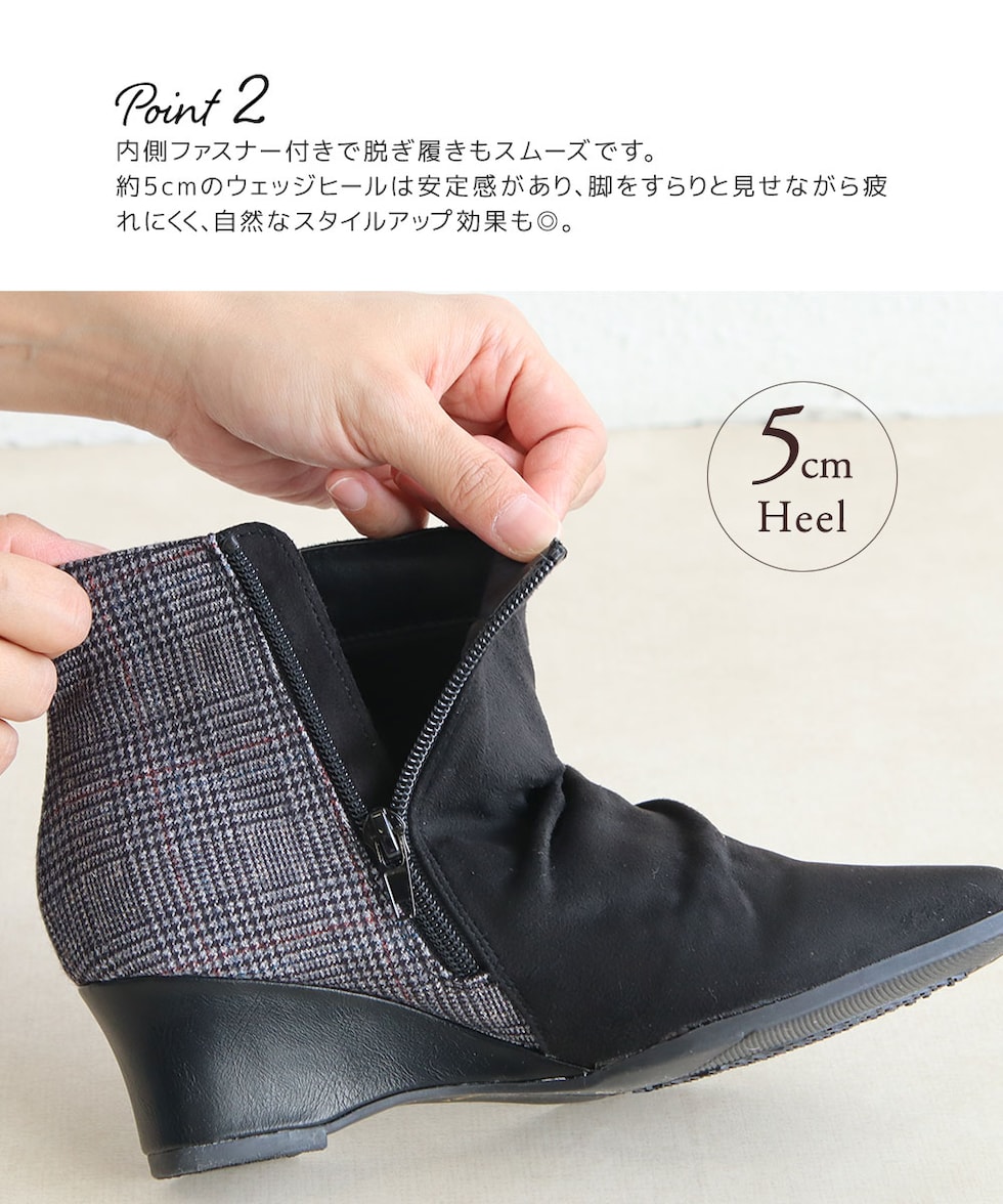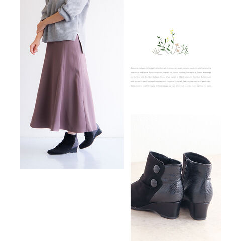 内側にはファスナー付きで脱ぎ履きしやすく、履き口のカーブラインが足首をすっきりと見せてくれます。