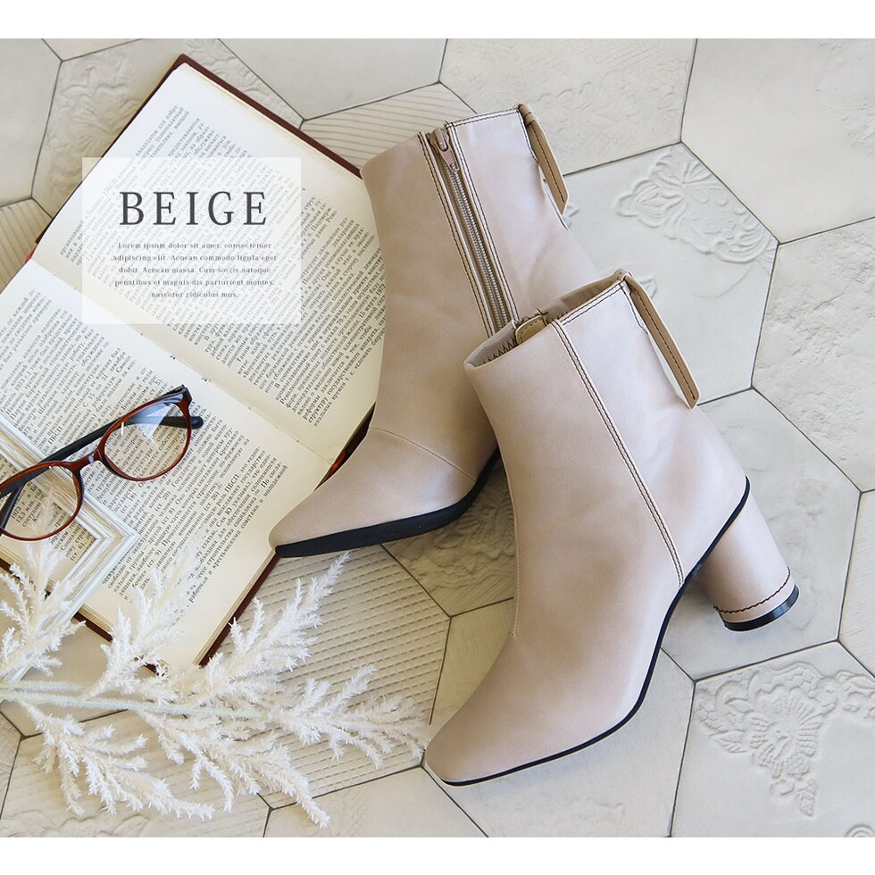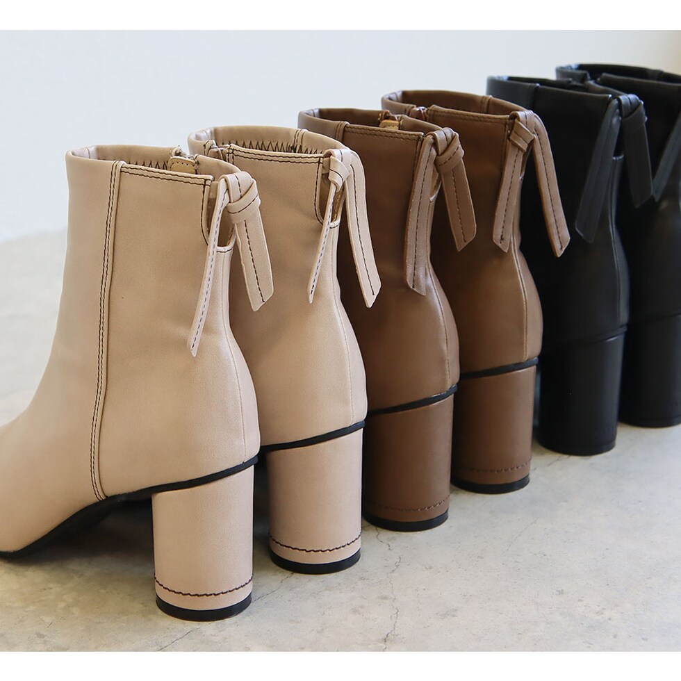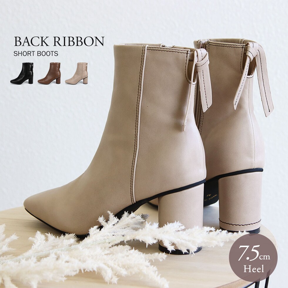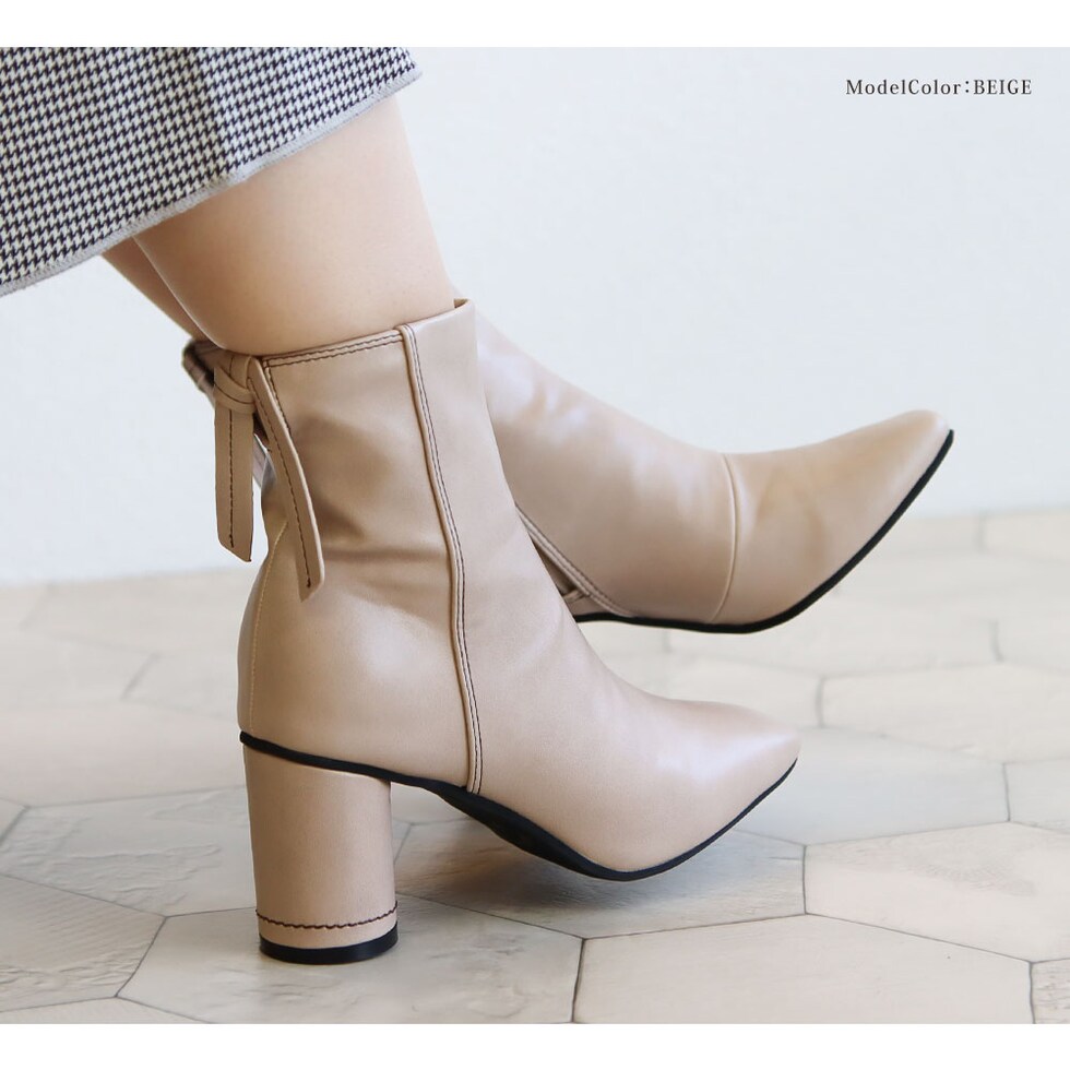 ショートブーツ レディース 歩きやすい 黒 ハイヒール ストレッチ ブーツ スクエアトゥ サイドファスナー スムース調 ミドルブーツ バックリボン ステッチ 円柱ヒール 丸ヒール おしゃれ 秋冬 大人 カジュアル トレンド ブラック ブラウン ベージュ ホワイト 6084
